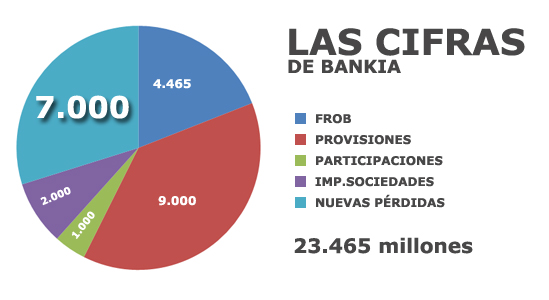 - Cuando se produce la dimisión de Rato, Goirigolzarri dice que necesita otros 10.000 millones extra. ¿De dónde vienen? De esos 10.000, hay 1.000 millones como consecuencia de que el valor de Iberdrola ha caído, que no habría por qué ponerlos, no es obligatorio ni contable ni económicamente y yo creo que no se justifica. Y en segundo lugar, Goirigolzarri dice con la situación que tengo, tengo unos créditos fiscales que significa que puedo dejar de pagar el impuesto de sociedades en el futuro y eso probablemente son 2.000 millones, con lo cual yo quiero 10.000, pero si le recapitalizan todo, como está pidiendo, claro que va a tener beneficios los próximos años, con lo que no habría que cubrir esa parte. Con lo cual, 1.000 millones de Iberdrola y asociados y otros 2.000 de impuesto de sociedades que efectivamente no va a pagar, realmente el agujero que habría que explicar es el de esos 7.000 millones de euros que ha aparecido. Ésa es la cifra que habría que haber explicado. Ése es el tamaño del problema nuevo. Lo otro está provocado por la necesidad de hacer provisiones. El problema no explicado es de alrededor de 7.000 millones, no 23.000 millones".