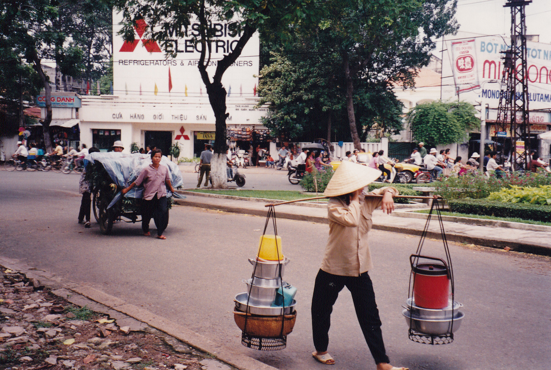 Mujer vietnamita con una "palanca" transportando cargas en Saigón, Vietnam, en 1994
