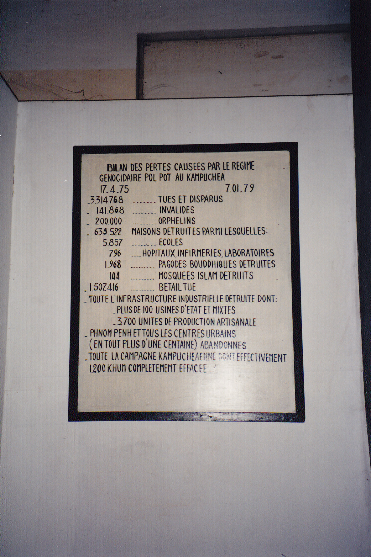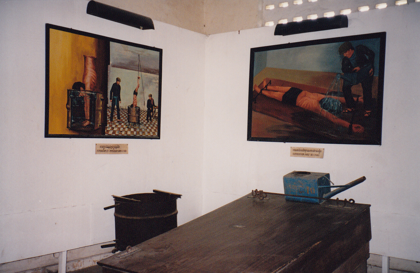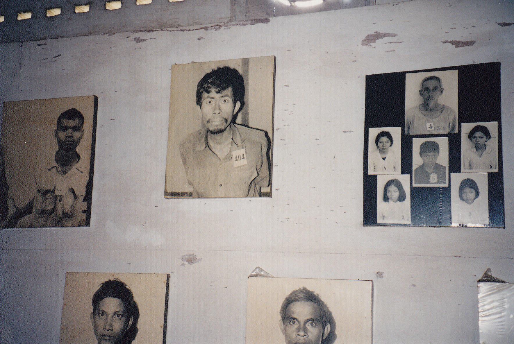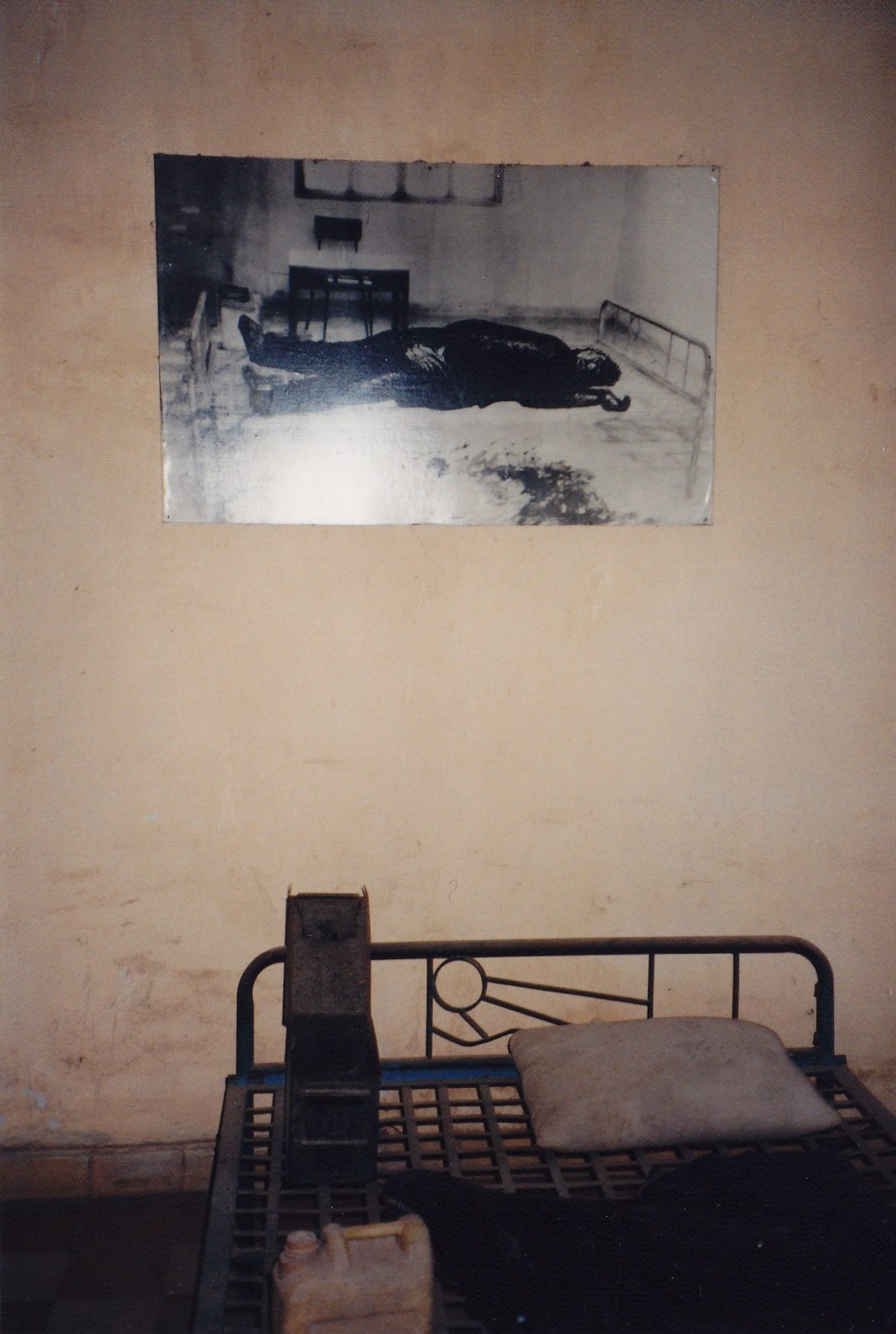 Fotografía tomada por Mercedes Rosúa en un viaje a Camboya. La foto muestra uno de los expositores de la prisión conocida como S-21, situada en Phnom Penh, y llamada "Tuol Sleng". En ella -antigua prisión de exterminio de los "Jemeres Rojos" durante el final de los 70- se expone un museo del genocidio camboyano. La fotografía es de 1994