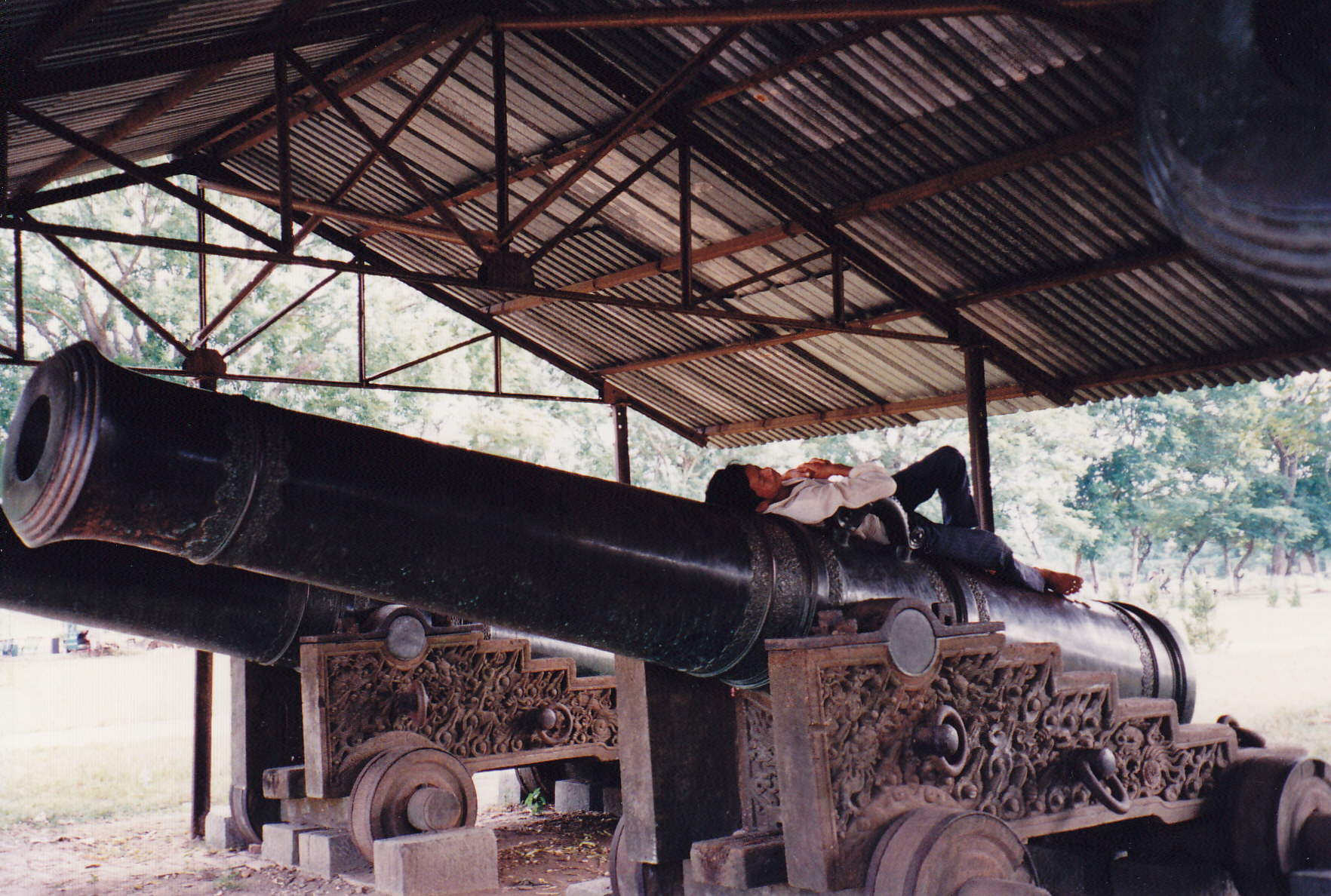 Fotografía tomada en Vietnam por Mercedes Rosúa en 1994. Un señor descansa encima de un cañón en las ruinas del palacio imperial de Hué. Mercedes Rosúa titulaba esta fotografía "La guerre est finie"