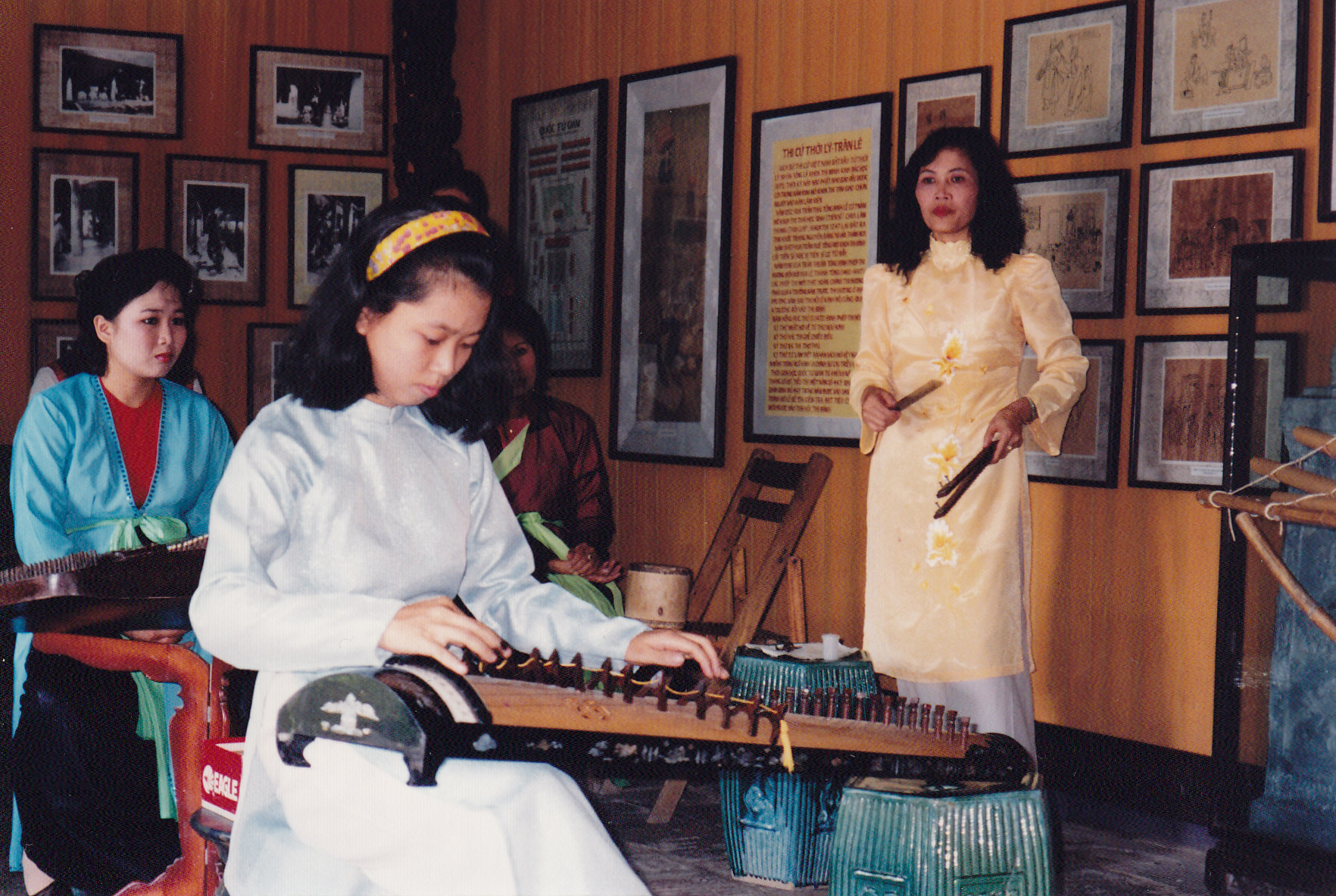Fotografía tomada en Vietnam por Mercedes Rosúa en 1994. Lección de música tradicional en los aledaños del palacio imperial de Hué