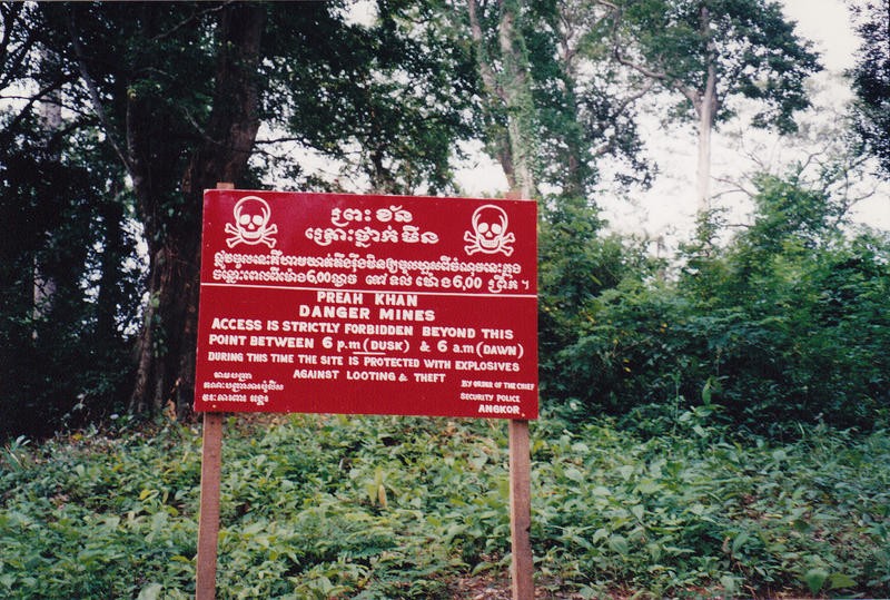 Cartel de advertencia en el campo minado de Preah Khan. Uno de los muchos campos minados que hay en Camboya. Este país tiene un enorme número de mutilados por este tipo de armamento militar. En 1994, cuando se tomó la foto, aún había mucho terreno minado.