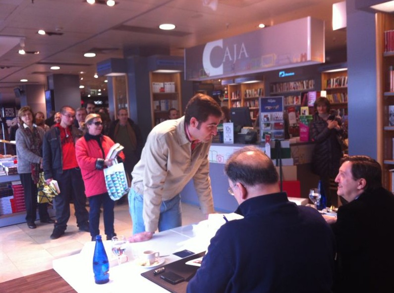 Federico Jiménez Losantos, conversa con uno de los seguidores que se acercó a El Corte Inglés de Princesa para obtener la firma de los autores de La libertad tiene un precio. Conversaciones.