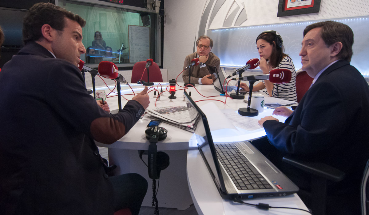 Carlos García y Federico Jiménez Losantos dialogan ante la atenta mirada de Luis Herrero y Rosana Laviada