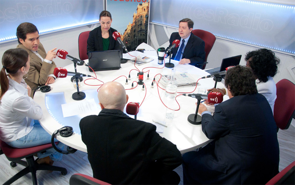 Junto a la invitada, en la mesa de tertulia Federico Jiménez Losantos, Dieter Brandau, Rosana Laviada, Tomás Cuesta, Gabriel Albiac y Maite Loureiro