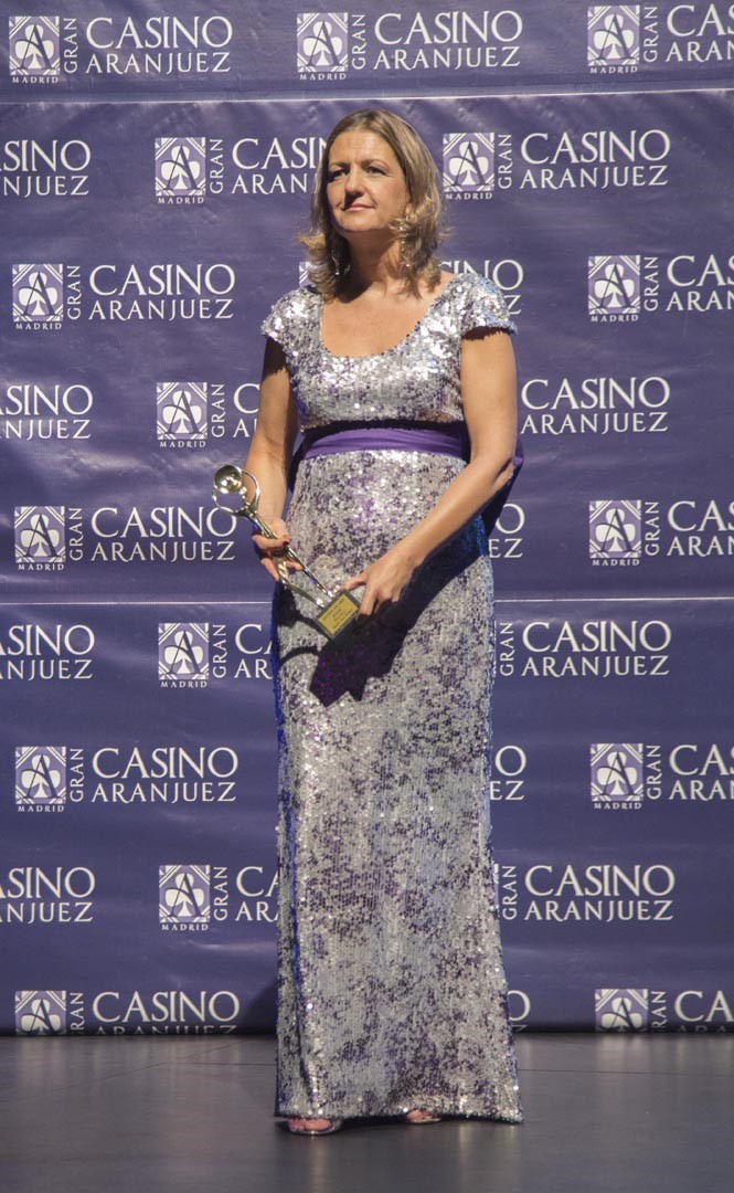 El periodista Alberto Castillón entregó la Antena de Oro a María josé Peláez, que subió al escenario con un diseño de Pilar Sáinz