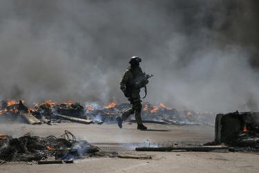 Un oficial ucraniano en un retén incendiado y abandonado por los pro rusos | Cordon Press