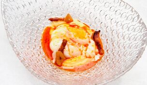 Presentación del plato de Rooster | esvivir.com Huevo pochado en manteca colorá, patata ahumada y tocino Alberto Fernández recomienda el restaurante Rooster y trae una receta recogida por esvivir.com.