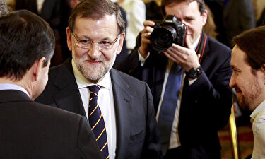 Mariano Rajoy junto a Andrés Herzog y Pablo Iglesias en el Congreso | EFE