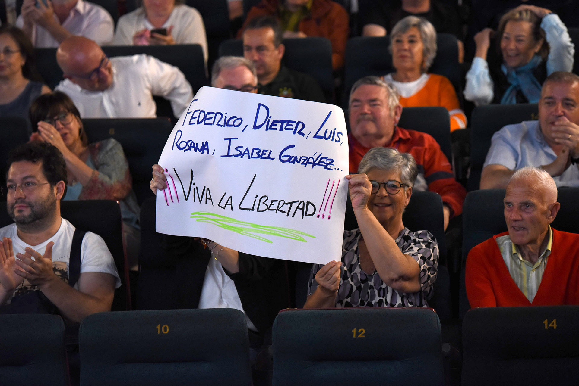 Una oyente de Es la Mañana de Federico, que asiste a la emisión en directo del programa especial desde el cine Palafox de Zaragoza, muestra una pancarta en la que se lee “Federico, Dieter, Luis, Rosana, Isabel González... ¡¡¡Viva la libertad!!!".