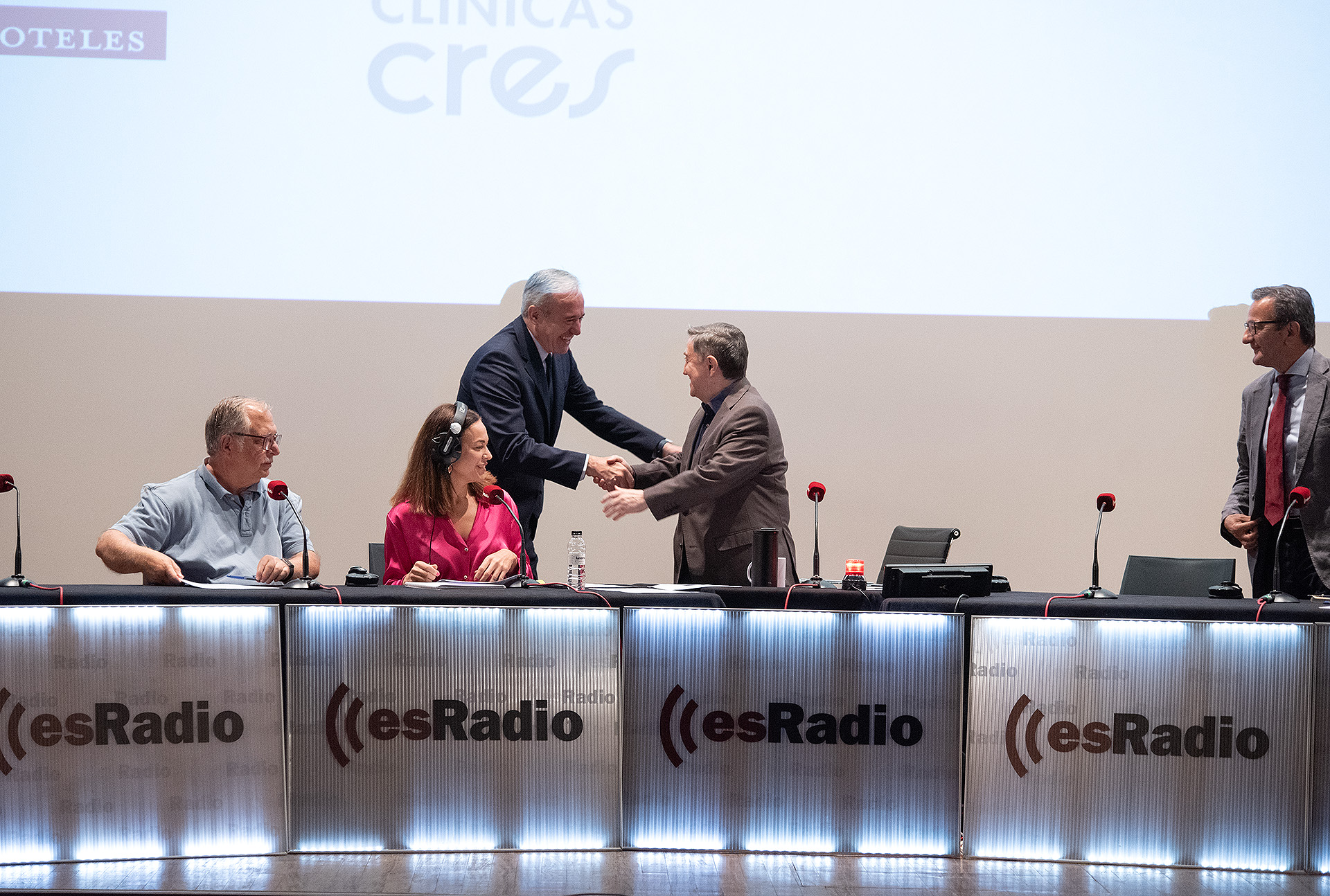 Federico Jiménez Losantos recibe a Jorge Azcón, presidente del Gobierno de Aragón, para ser entrevistado en directo en el cine Palafox de Zaragoza, durante la emisión del programa especial de Es la Mañana.