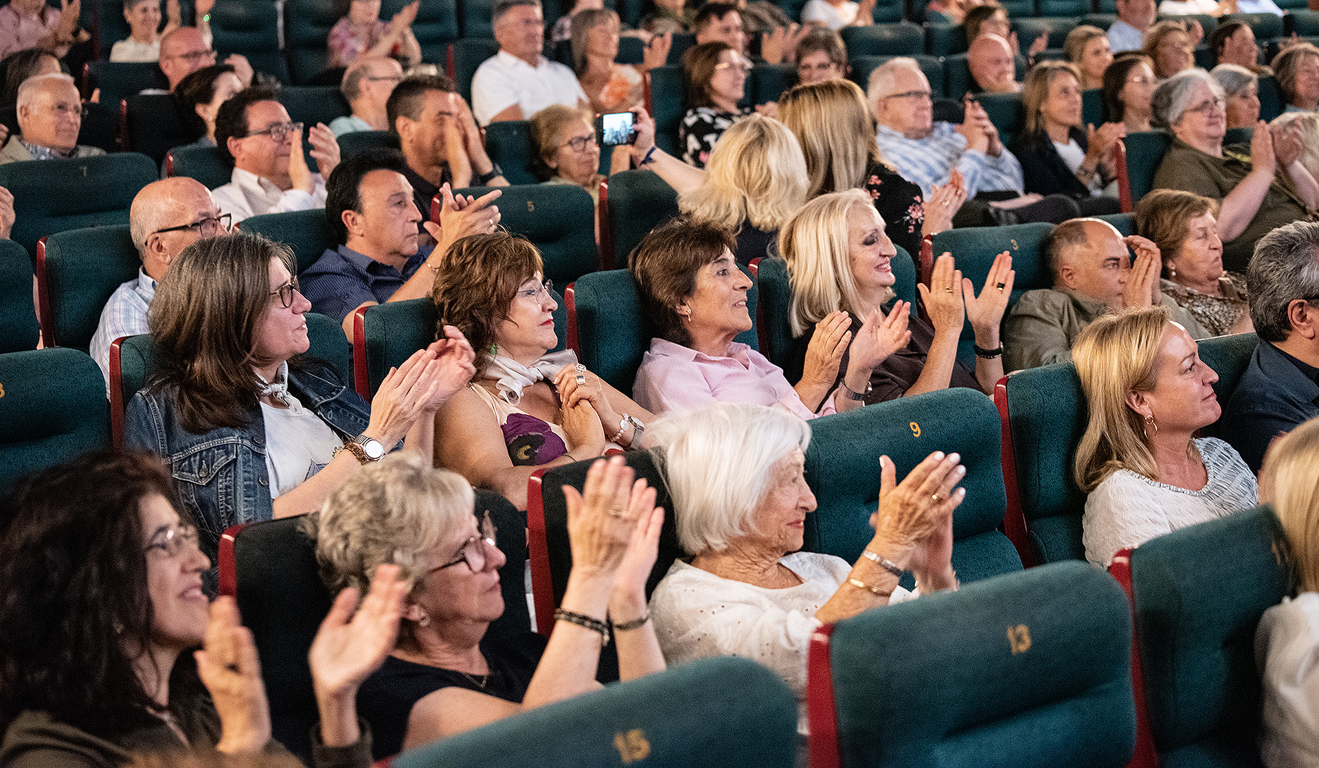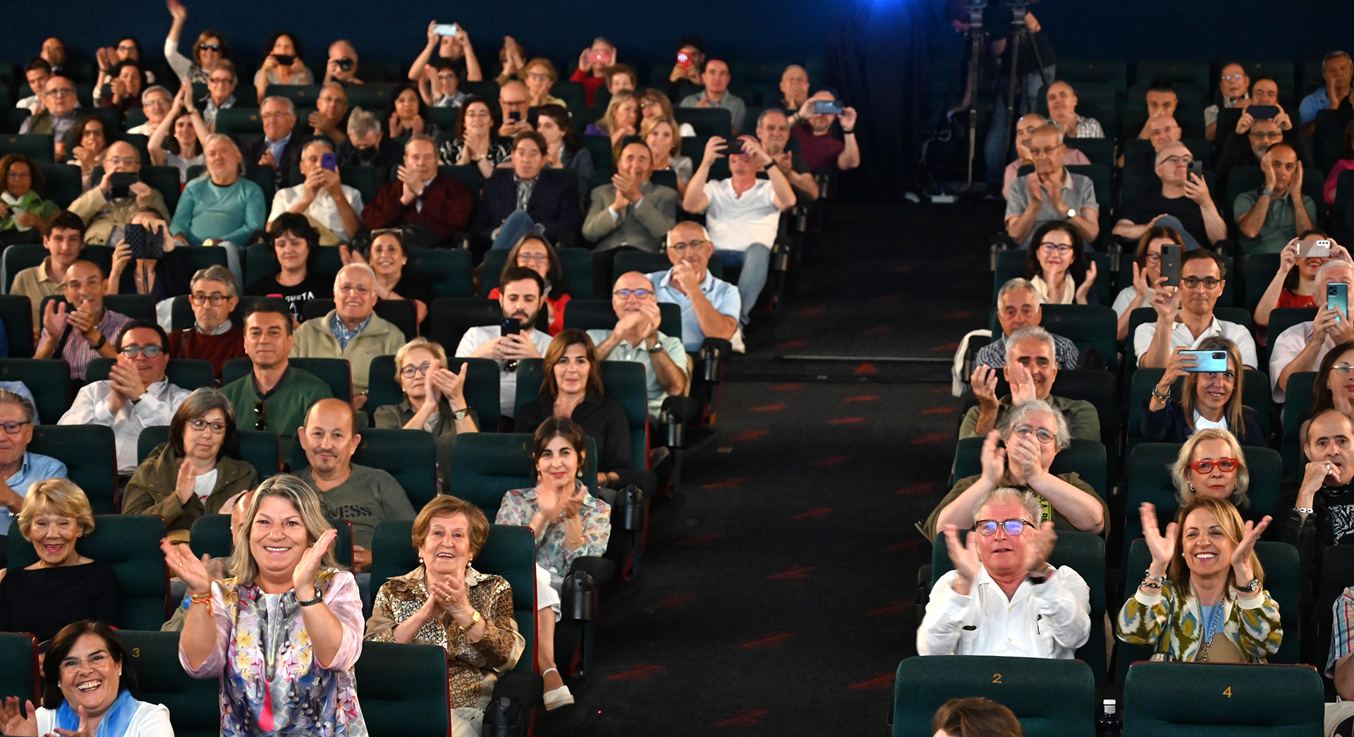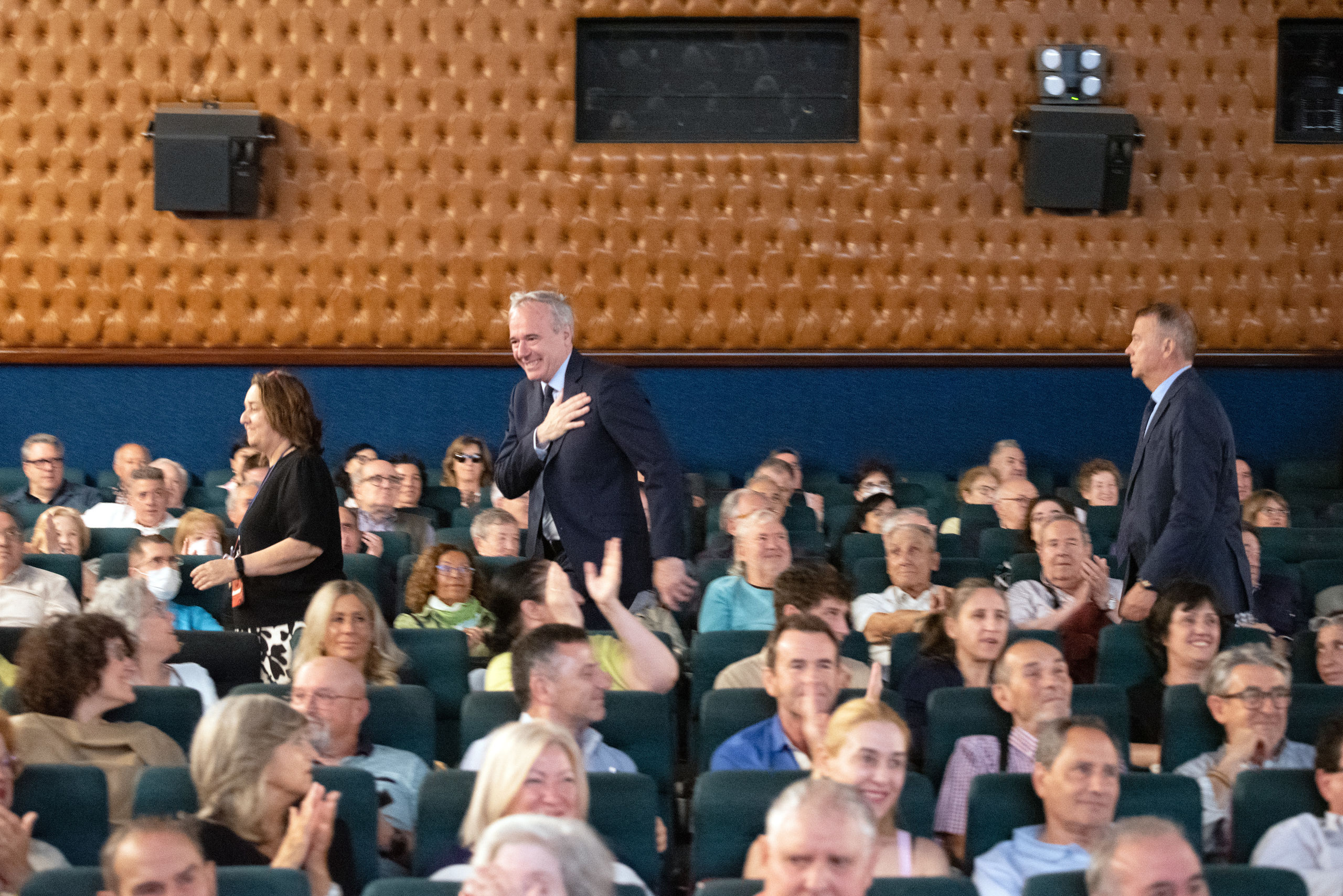 Panorámica del público que asiste en directo al programa especial de Es la Mañana de Federico desde el cine Palafox de Zaragoza. De espaldas, Federico y Rosana Laviada.