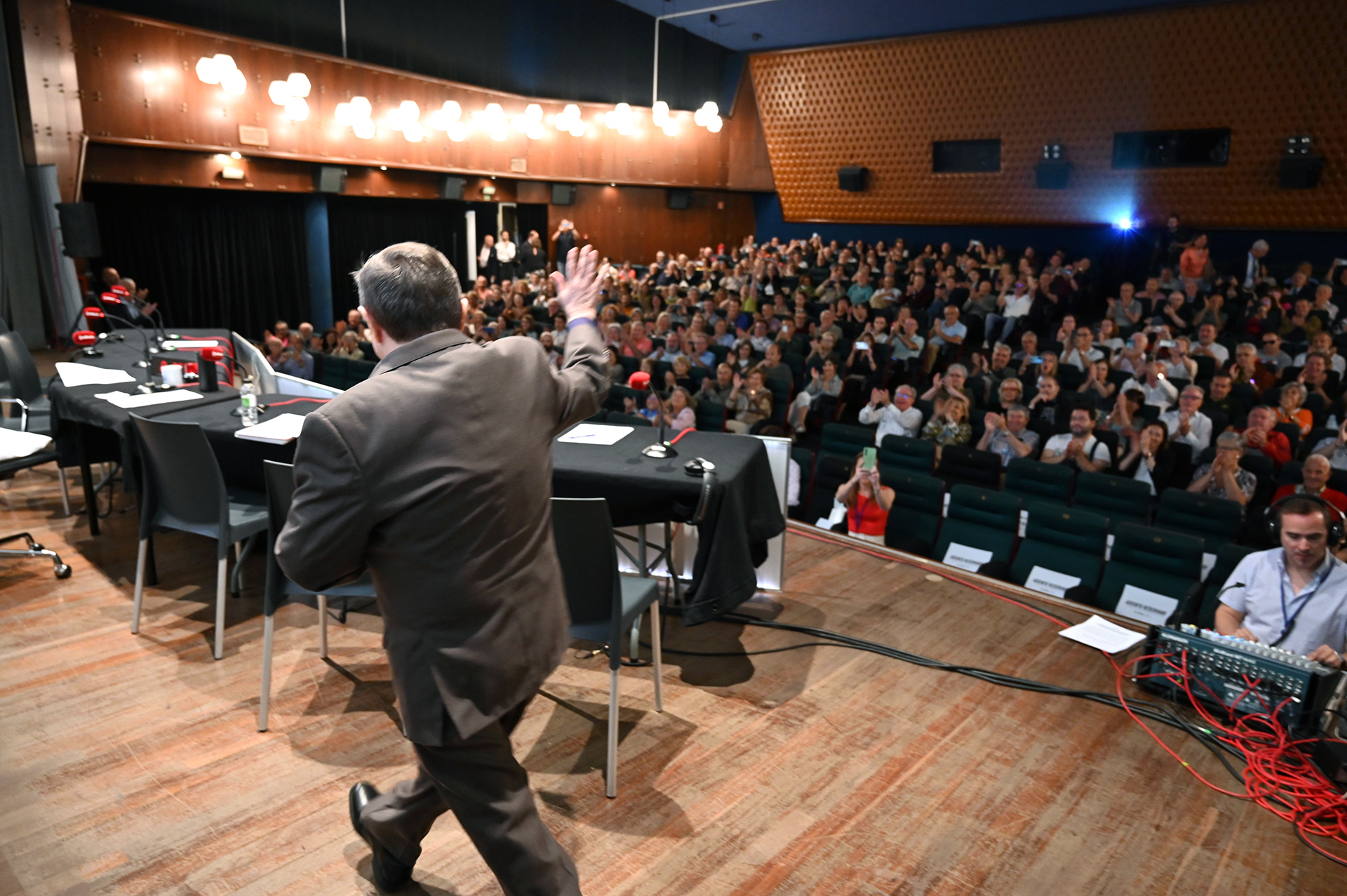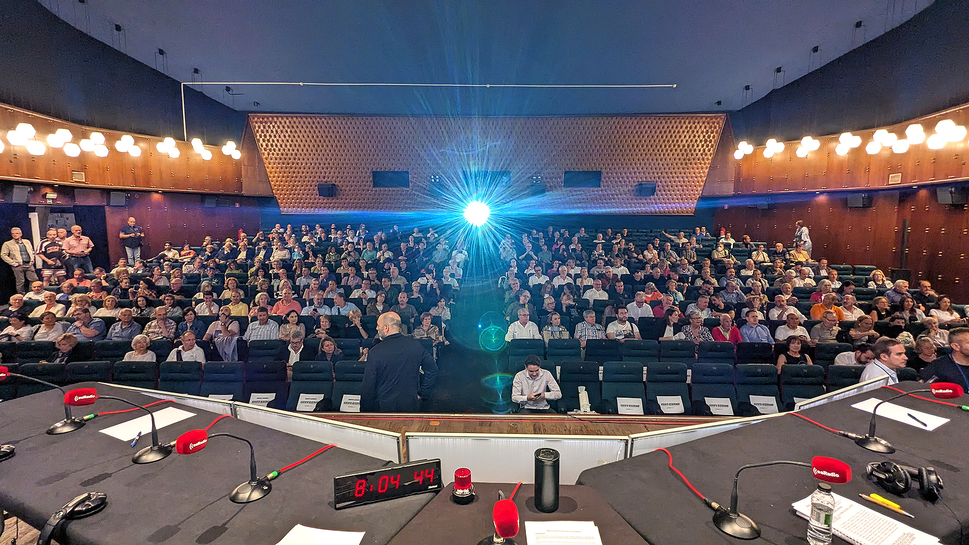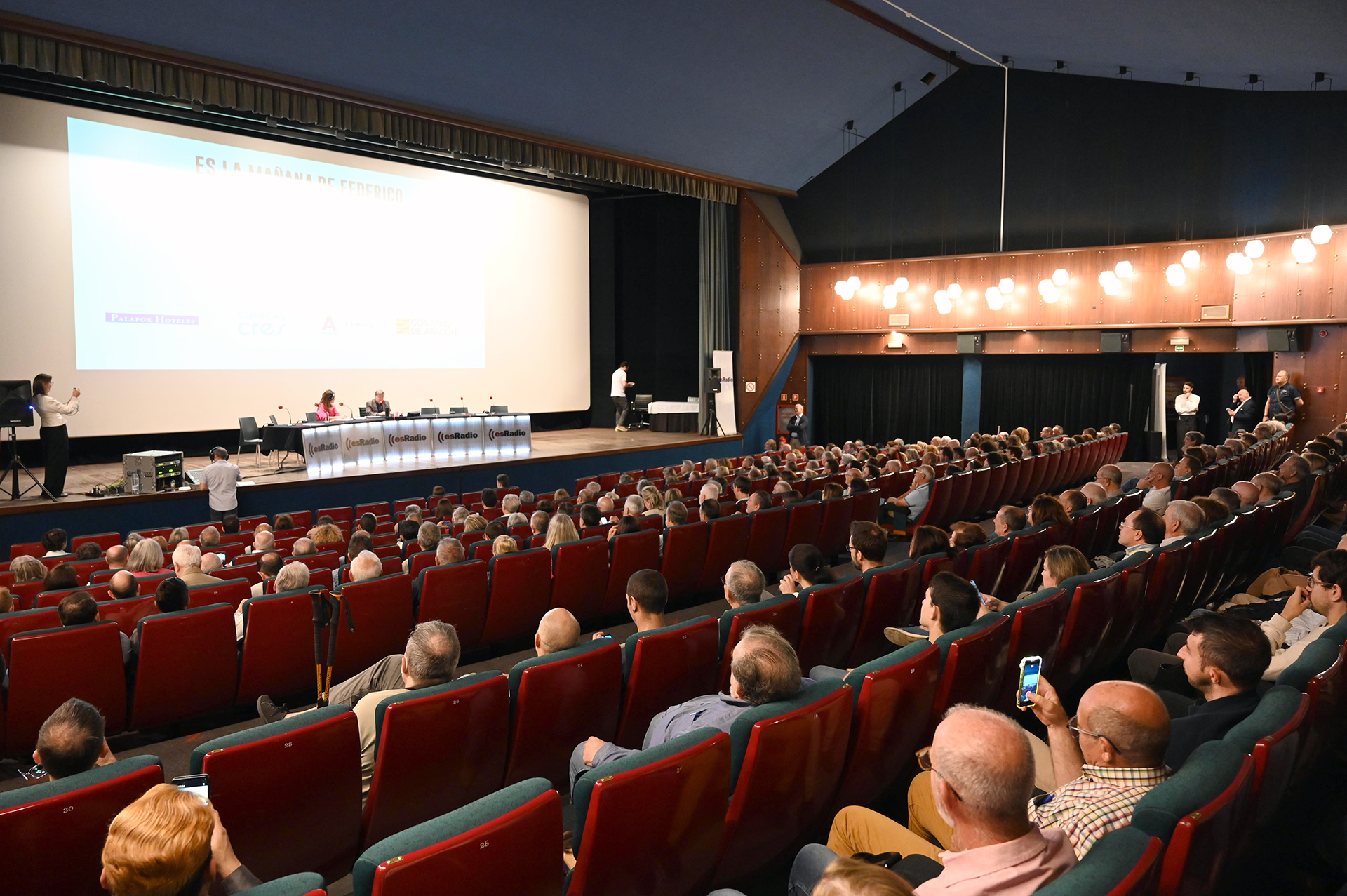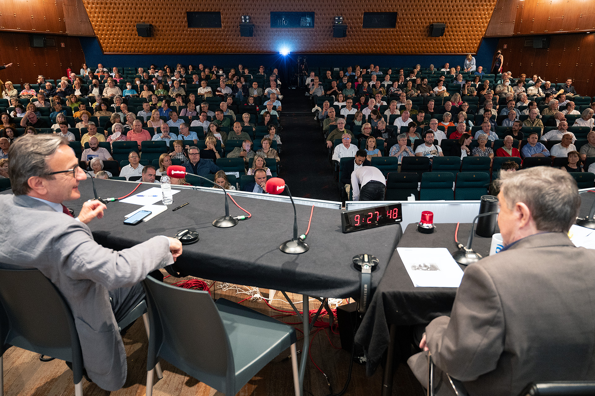 Panorámica del público que asiste en directo al programa especial de Es la Mañana de Federico desde el cine Palafox de Zaragoza. De espaldas, Federico y Rosana Laviada.