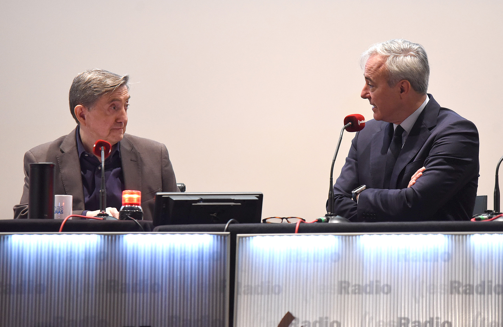 Un momento de la entrevista de Federico Jiménez Losantos a Fernando de Yarza durante la emisión en directo desde el cine Palafox de Zaragoza de Es la Mañana. De Yarza es presidente del grupo Henneo y presidente de la Asociación Mundial de Periódicos y Editores de Noticias (WAN-IFRA).