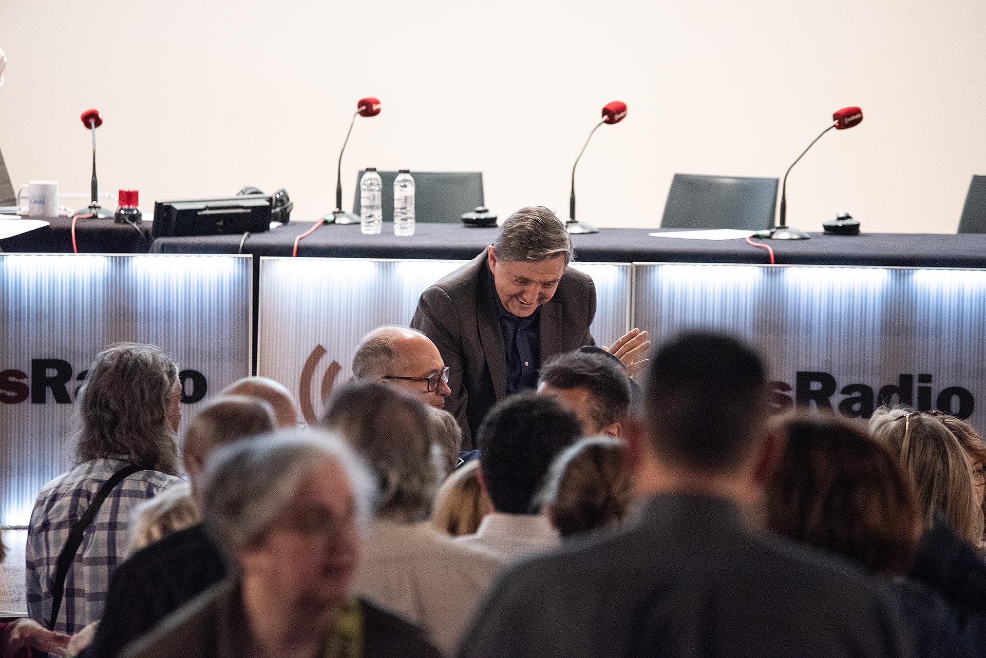 Entrada de Federico Jiménez Losantos, presidente del Grupo Libertad Digital, en el escenario del cine Palafox durante la emisión del programa especial de Es la Mañana en Zaragoza.