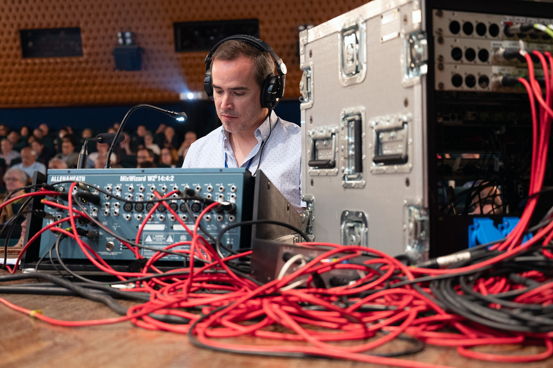 Joserra de las Peñas, técnico de Es la Mañana de Federico, durante la emisión especial en directo del programa en el cine Palafox de Zaragoza.