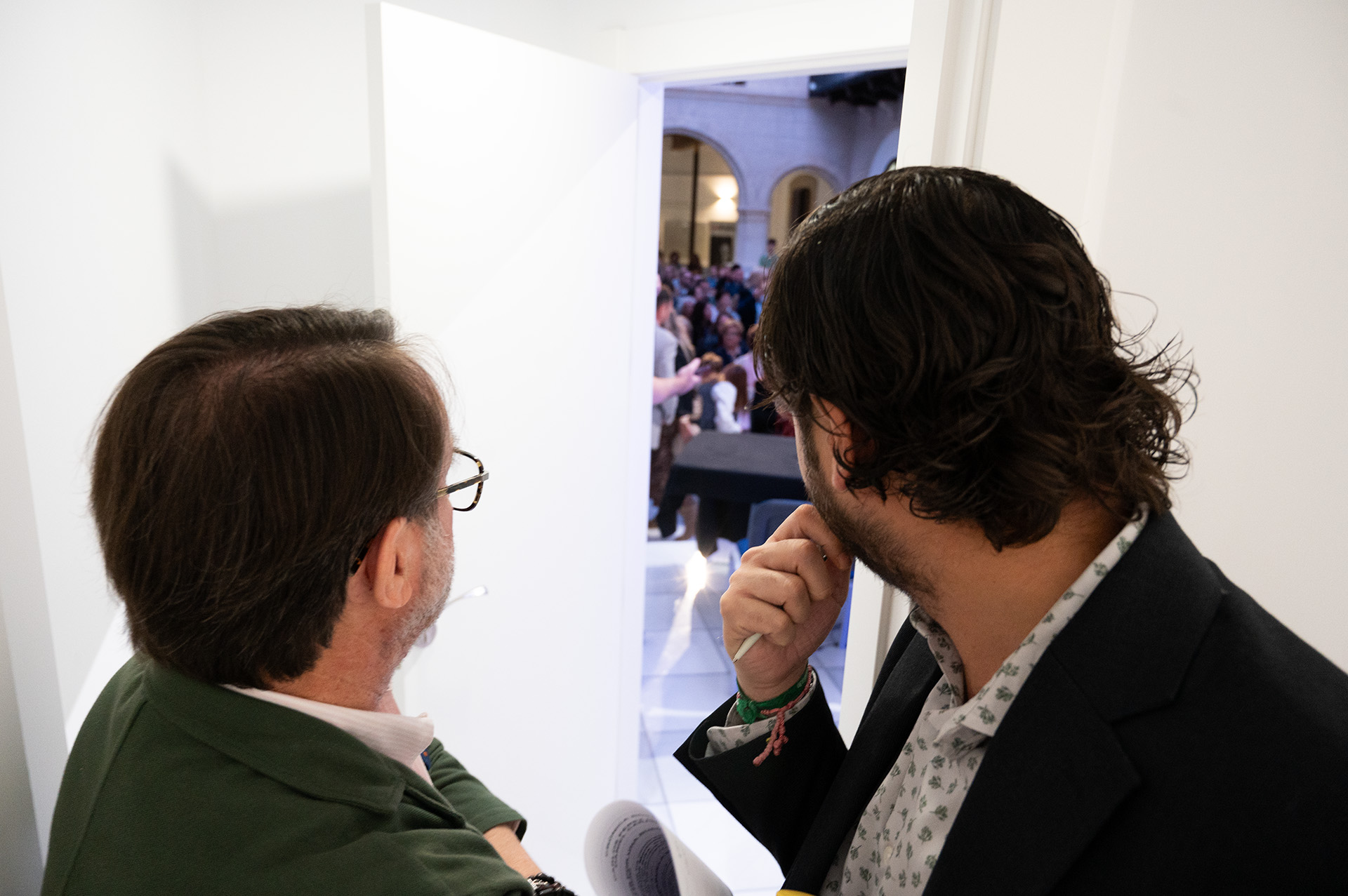 Carlos Pérez Gimeno y Daniel Carande se asoman al escenario lleno de público, segundos antes de entrar en la Crónica Rosa.