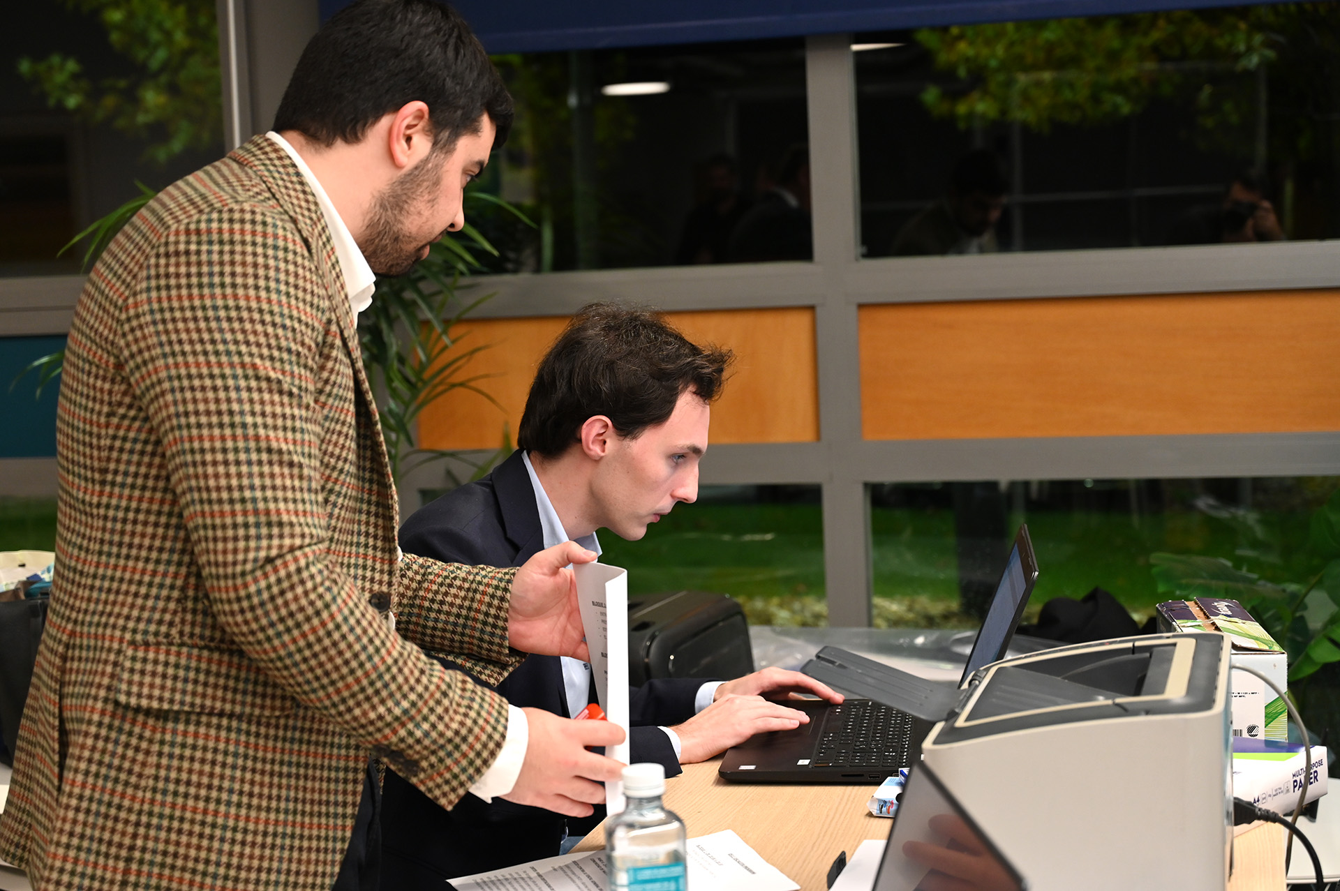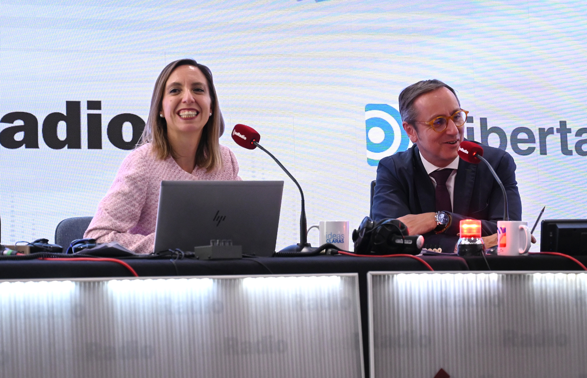 El director de los informativos de esRadio, Juan Pablo Polvorinos, y el presidente de Iustitia Europa, Luis María Pardo, durante la tertulia del programa especial de ‘La noche de Cuesta’, en directo desde Las Rozas.