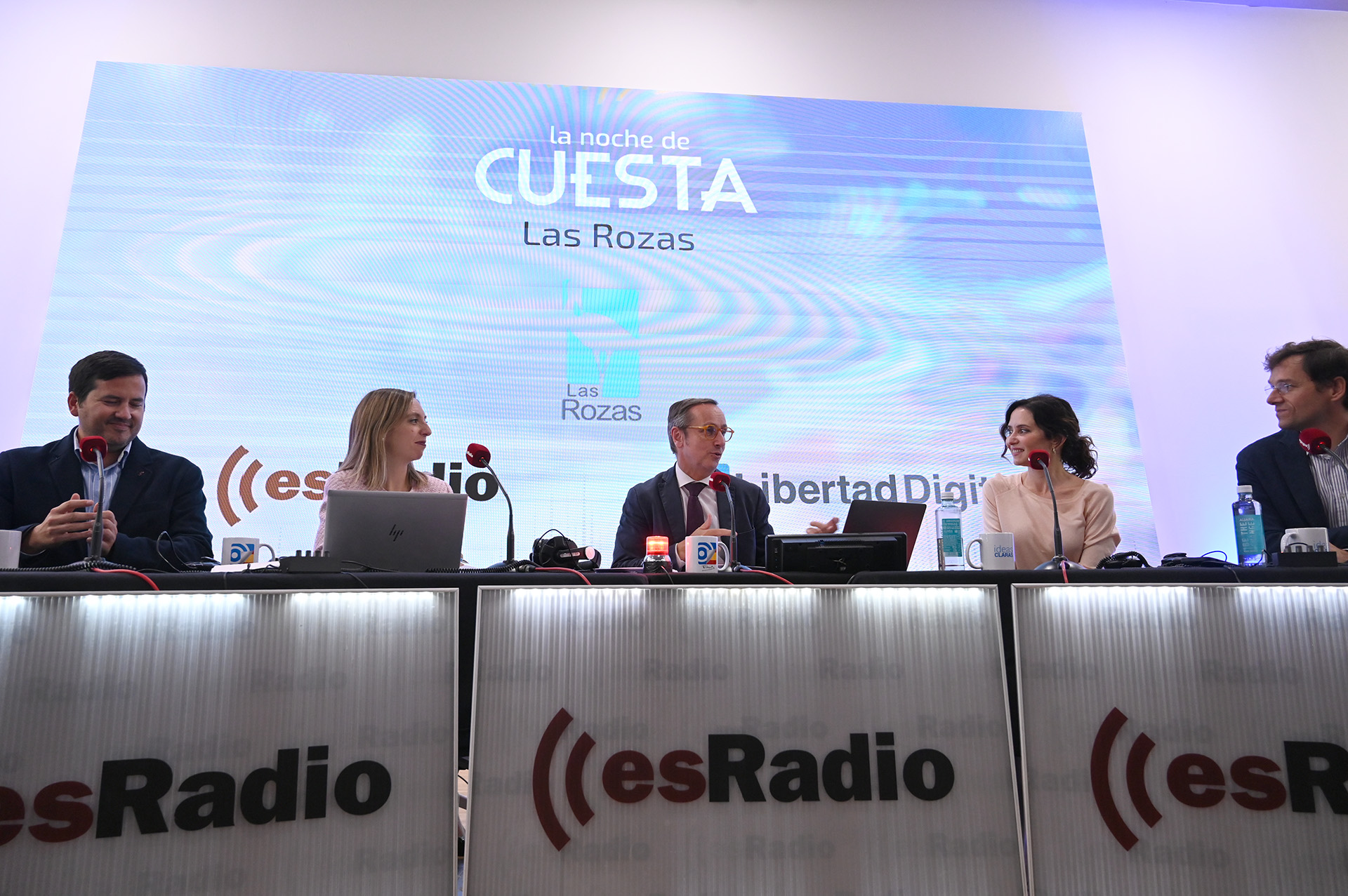 Miguel Ángel Pérez, Sandra León, Carlos Cuesta, la presidenta de la Comunidad de Madrid, Isabel Díaz Ayuso y Juan Pablo Polvorinos en el programa especial en directo de ‘La noche de Cuesta’ en Las Rozas.