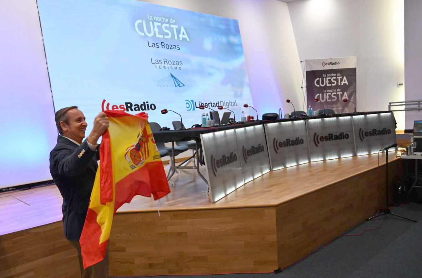 Carlos Cuesta en su bienvenida al programa de ‘La noche de Cuesta’, en directo desde Las Rozas. El periodista ha presentado el comienzo del programa con la bandera de España y con su mítica frase: “Viva España y viva la libertad".