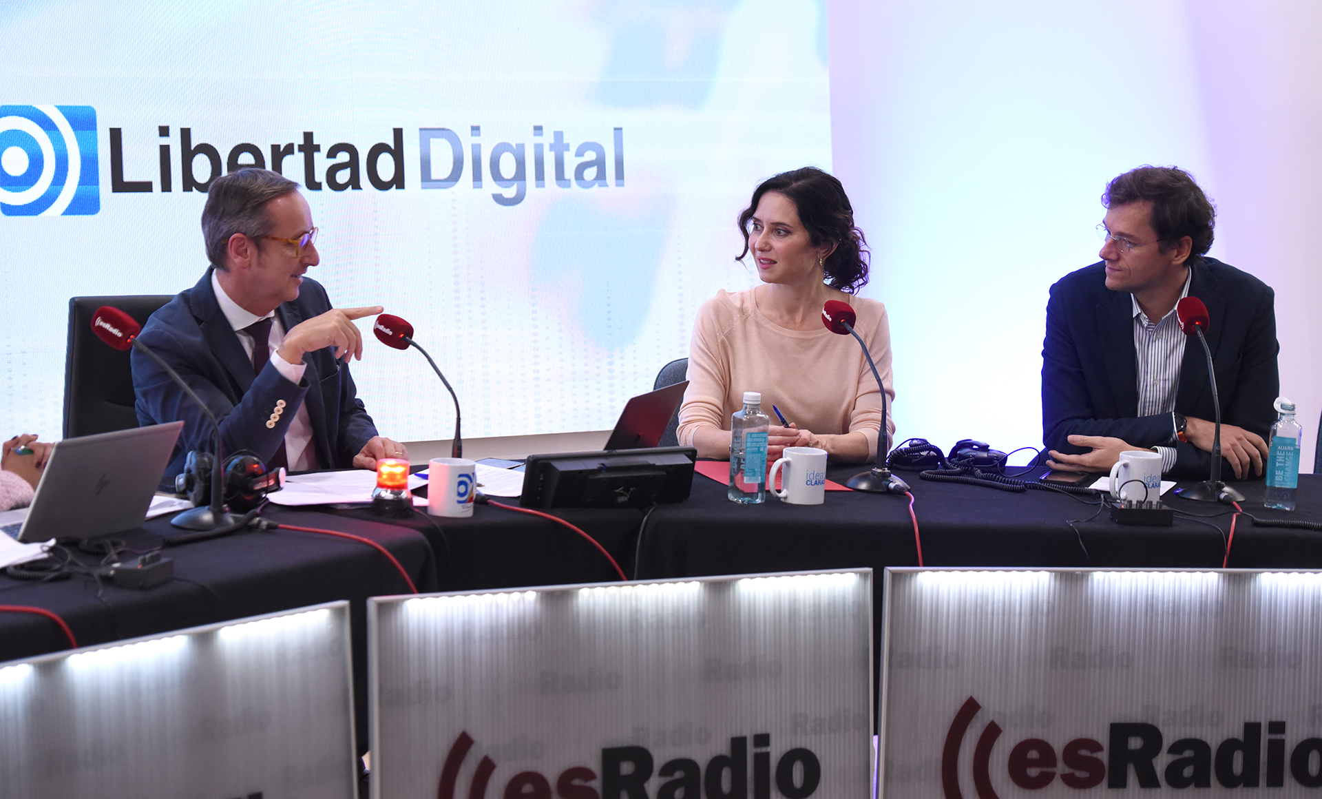 La presidenta de la Comunidad de Madrid, Isabel Díaz Ayuso, y el director de Libertad Digital, Javier Somalo, en el programa especial ‘La noche de Cuesta’, en directo desde el HUB232, en Las Rozas.