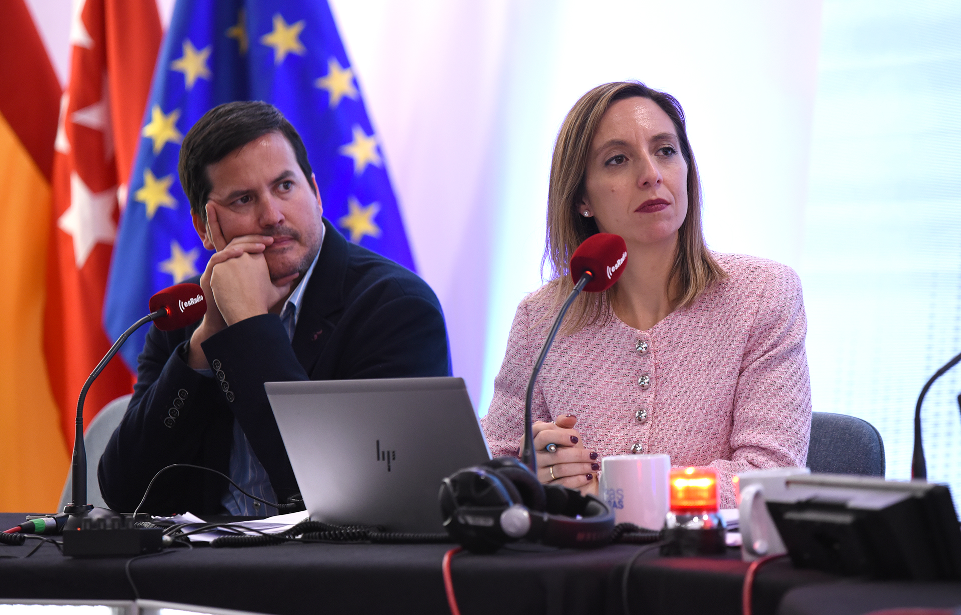 El periodista de tribunales de Libertad Digital, Miguel Ángel Pérez, y la subdirectora del programa ‘La noche de Cuesta’, Sandra León, en el programa especial emitido en directo desde Las Rozas.