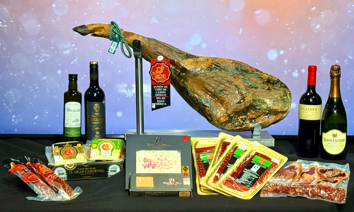 - Un Jamón de Cebo de Campo Ibérico de Guijuelo TuJamónDirecto (de 7 a 7,5 kg) entero (se incluye opción de loncheado con un incremento de 20€), más una vela de chorizo ibérico y una vela de salchichón ibérico.