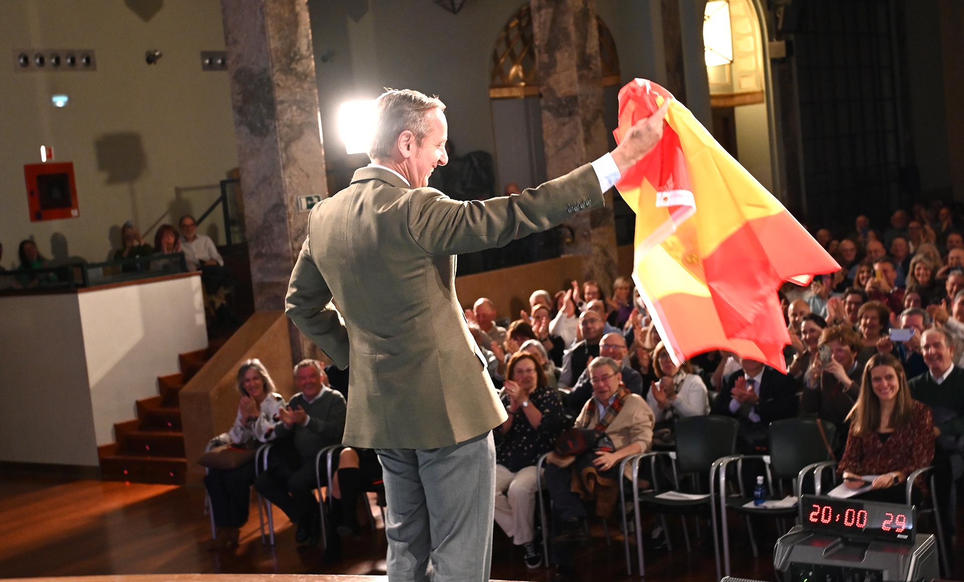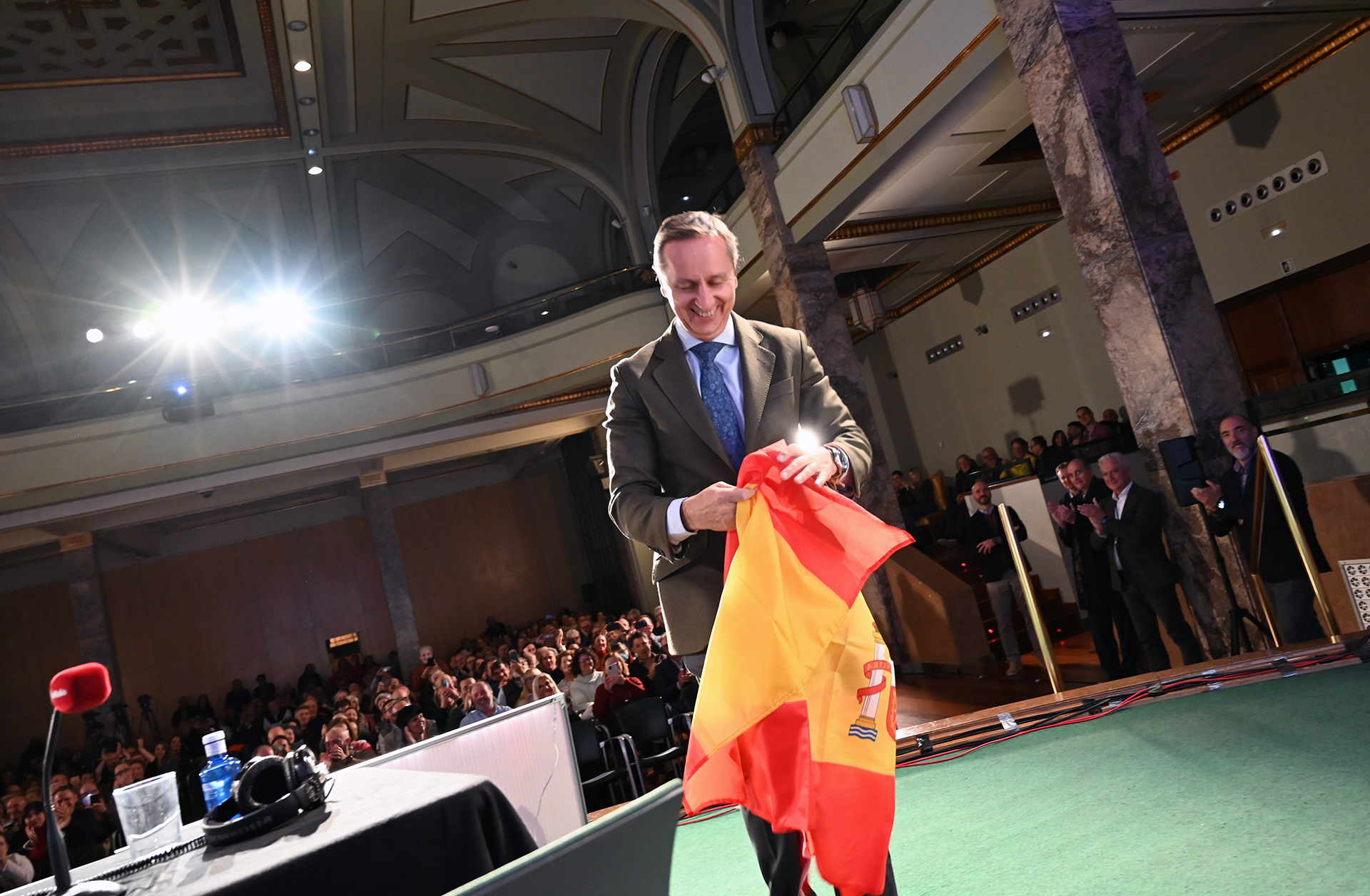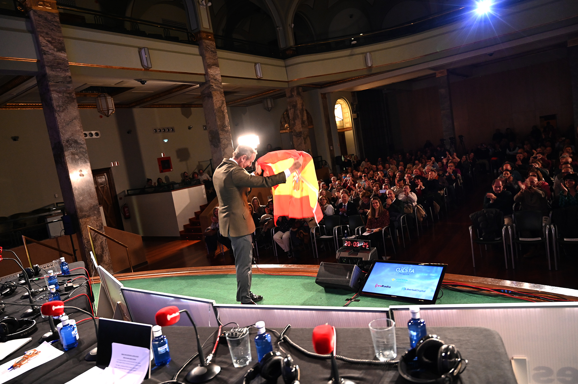 Carlos Cuesta ha comenzado su programa especial con el ya tradicional saludo al público con la bandera de España.
