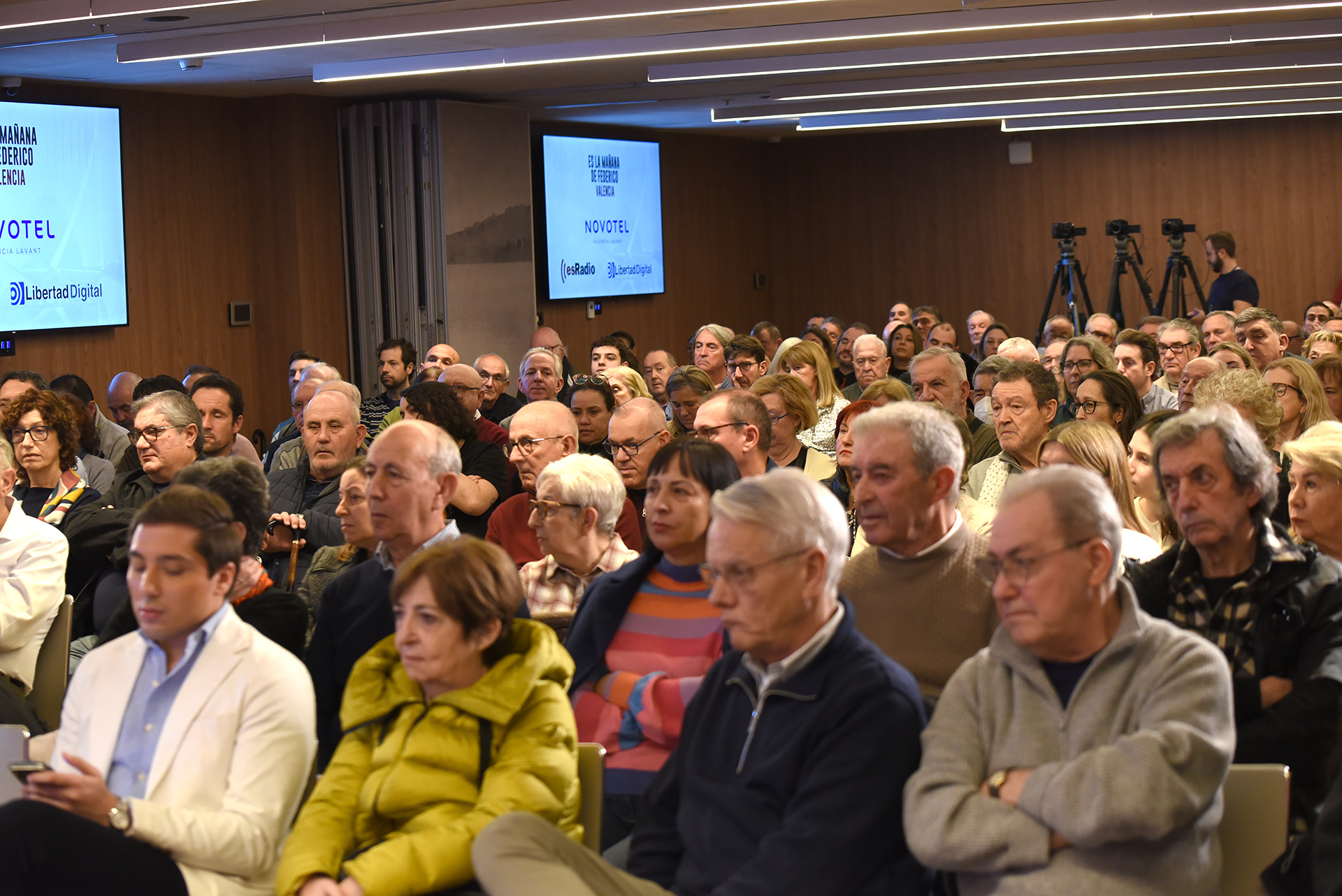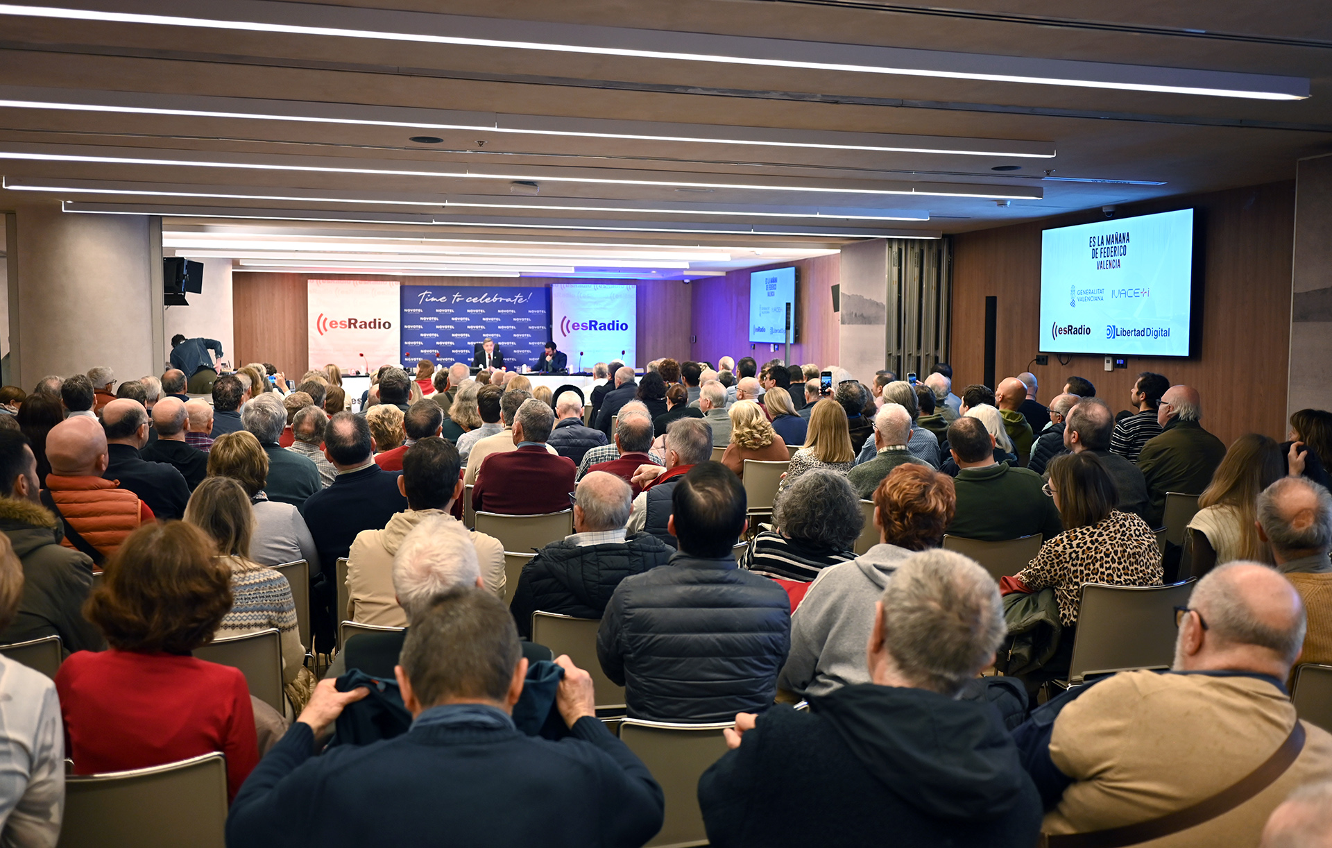 Federico Jiménez Losantos, director de Es la Mañana de Federico en esRadio, ha sido recibido con una cerrada ovación y un lleno absoluto en el Hotel Novotel Lavant de la capital del Turia.