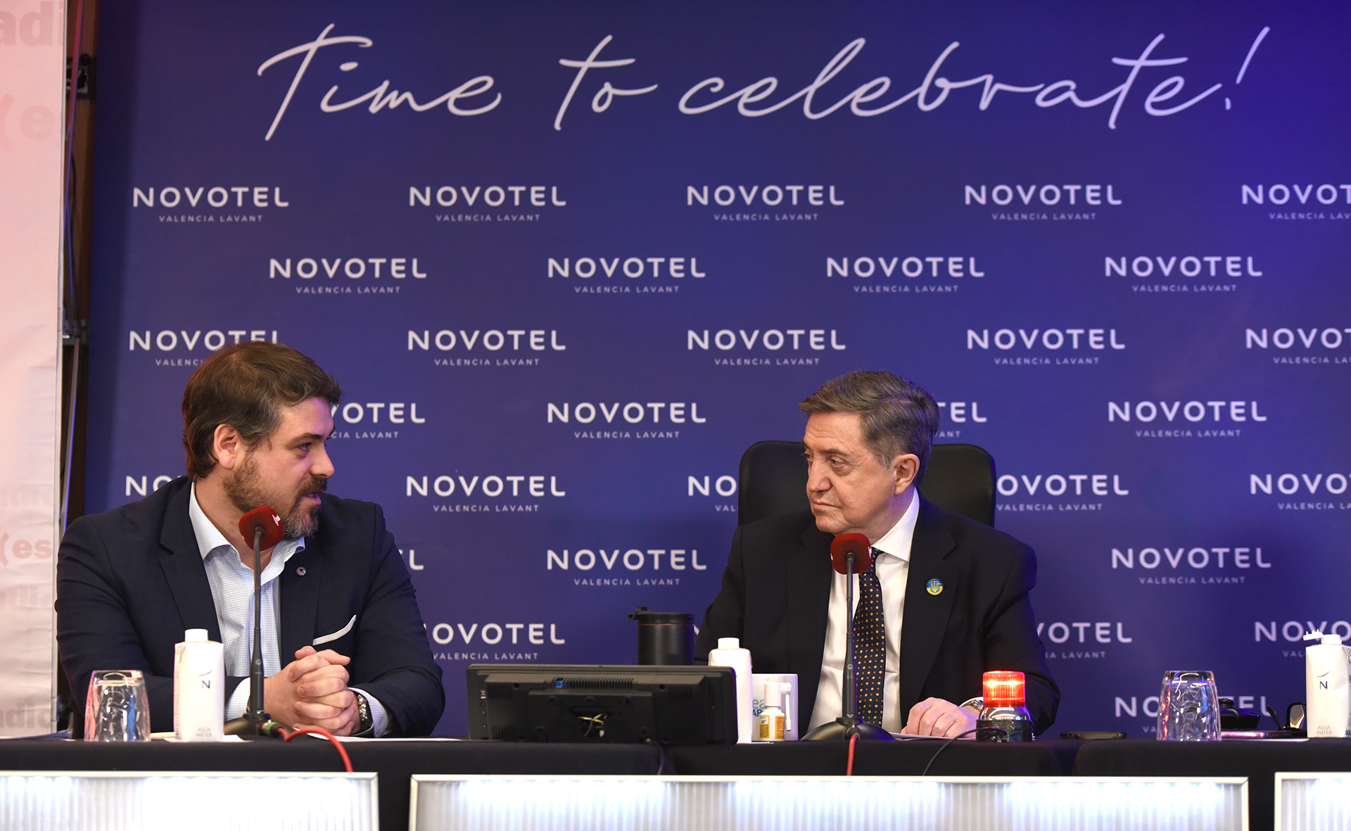 Federico Jiménez Losantos atento a las palabras del Rodrigo Gomes, director del Hotel Novotel de Valencia.