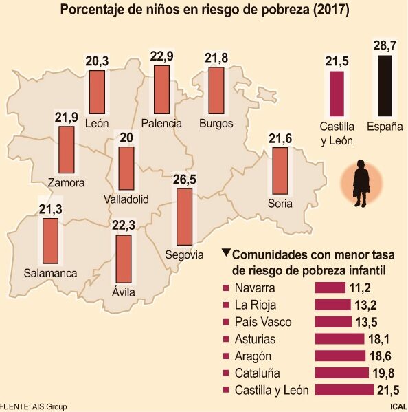 El 21,5 por ciento de los niños de Castilla y León viven en situación de riesgo de pobreza, según se desprende de los datos que la consultora española AIS Group, especialista en la generación de indicadores, ha publicado a partir de sus indicadores Habits Big Data. De acuerdo con su información, en el conjnuto del país la media se sitúa en el 28,7 por ciento, con Extremadura a la cabeza alcanzando un ratio del 51,9 por ciento.