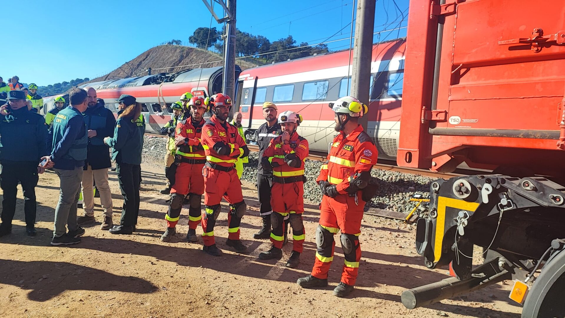 Equipos de la UME desplazados a Adamuz trabajan en el lugar de la colisión. | Javier García