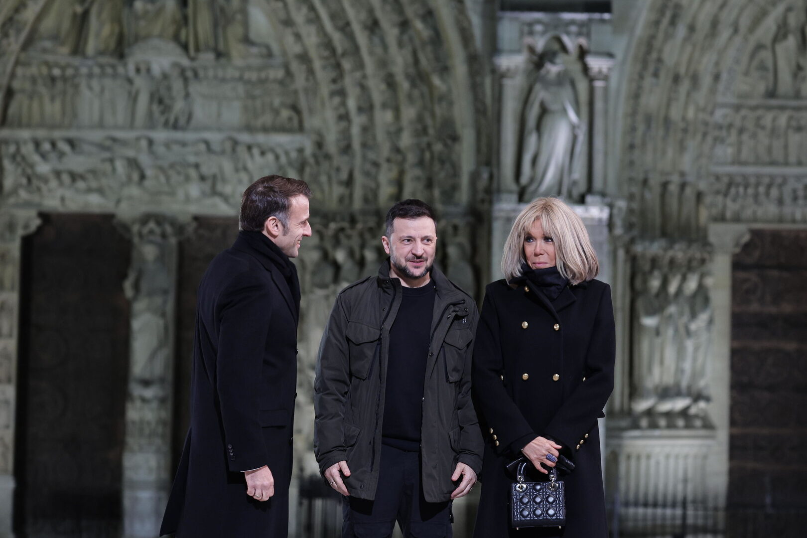 Emmanuel Macron y su mujer Brigitte reciben al presidente de Ucrania, Volodymyr Zelensky para la ceremonia de reapertura de Notre Dame. | EFE/EPA/CHRISTOPHE PETIT TESSON