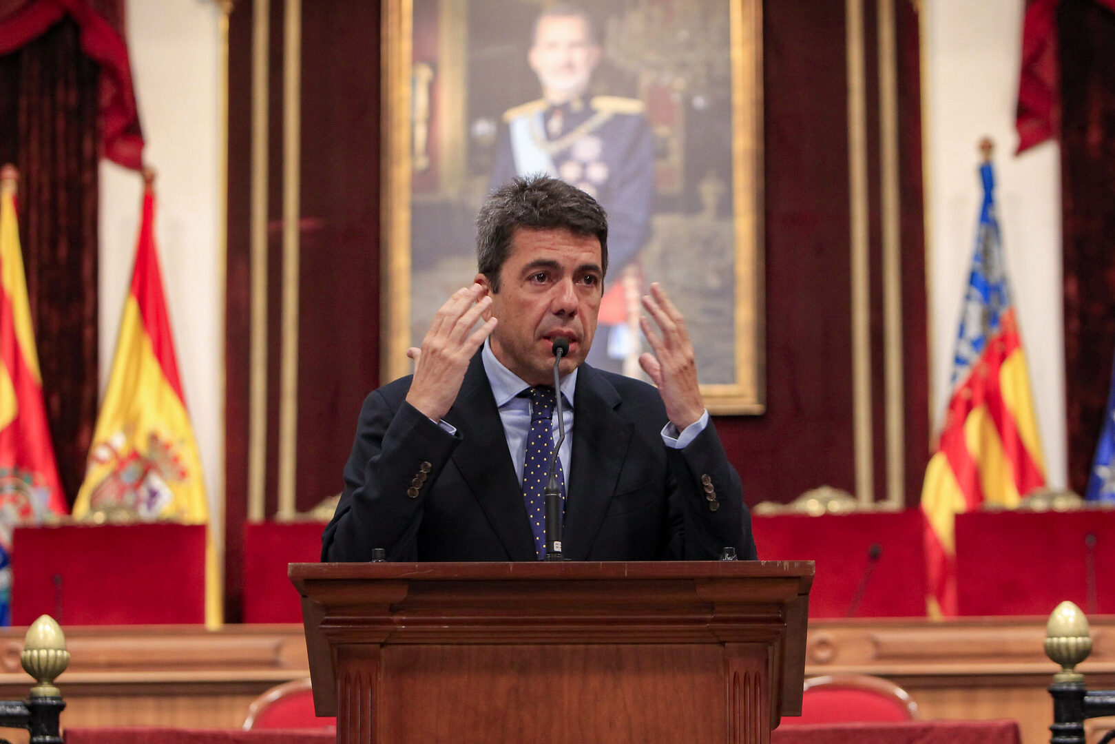 El presidente de la Generalidad valenciana, Carlos Mazón, durante su intervención tras la firma de convenios para proyectos en la ciudad de Elche. | EFE