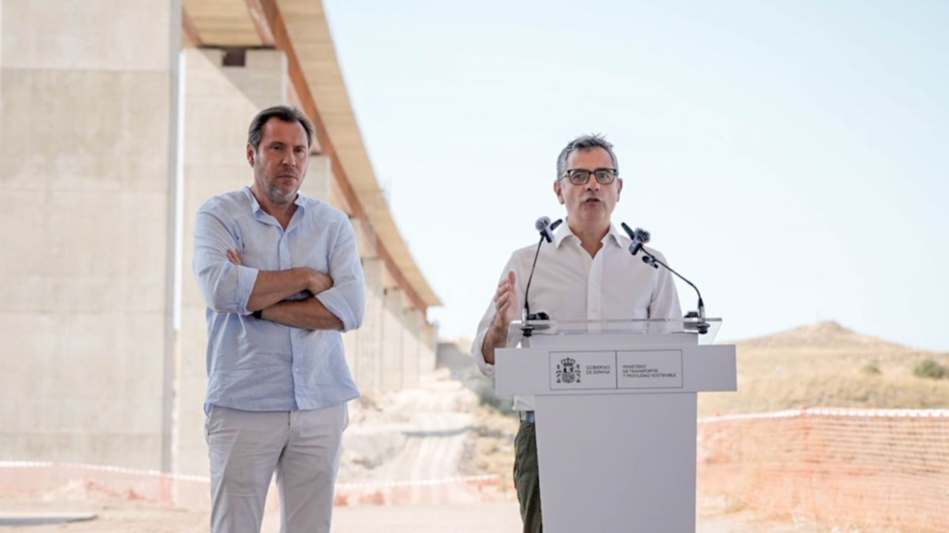 El ministro de Transportes y Movilidad Sostenible, Óscar Puente (i) junto al ministro de la Presidencia, Justicia y Relaciones con las Cortes, Félix Bolaños (d), intervienen durante la visita a las obras del Viaducto de los Feos, conexión ferroviaria de la línea en Alta Velocidad entre Murcia y Almería. A 13 de agosto de 2025 en Almería (Andalucía, España). La construcción de la línea de alta velocidad (LAV) Murcia-Almería, es un eje estratégico del Corredor Mediterráneo que cuenta con una inversión de 3.500 millones de euros, la línea cuenta con 198 kilómetros (km) de longitud, 90 km de vías en la provincia de Murcia y 108 km en la de Almería. | Marian León / Europa Press