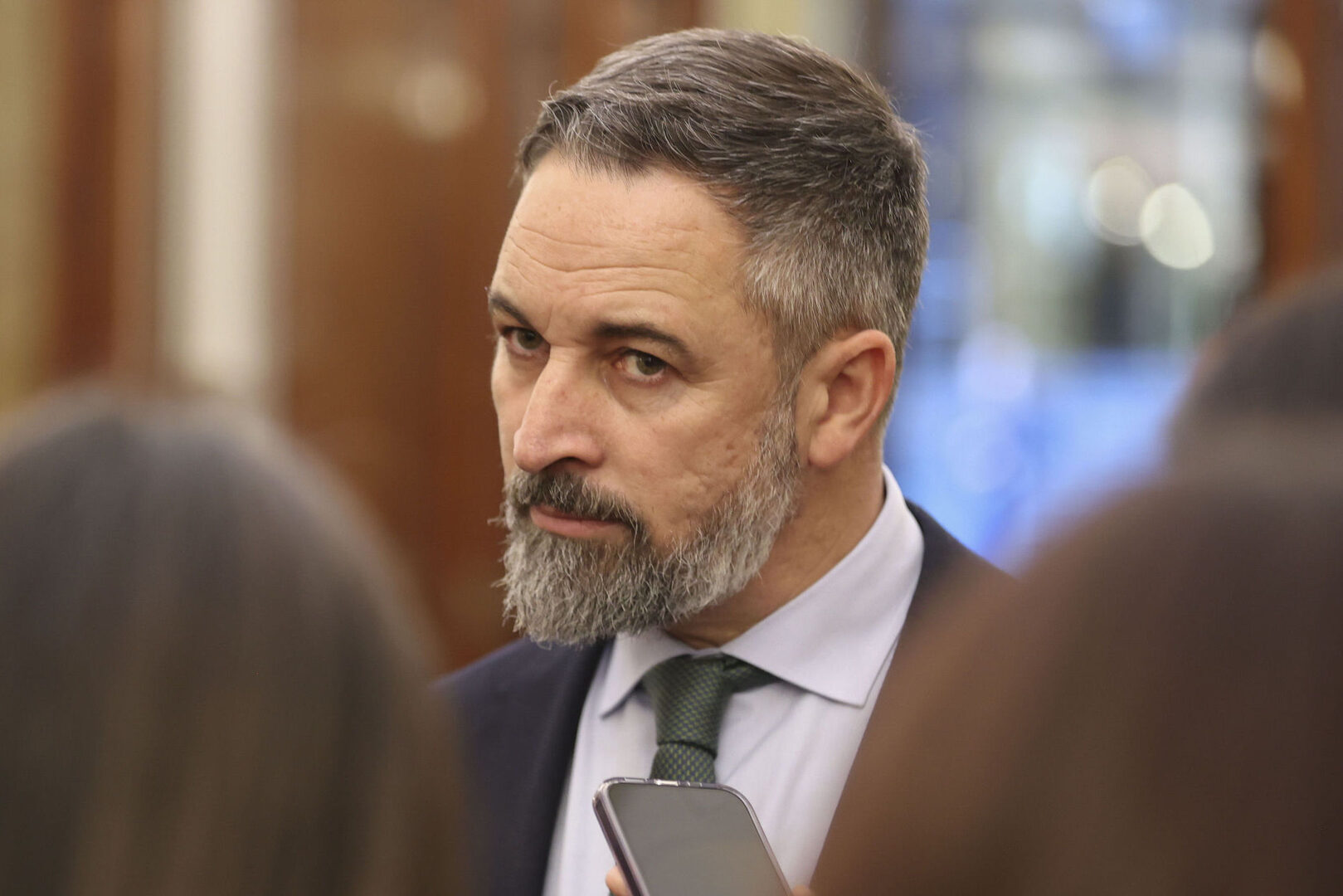 Santiago Abascal atiende a la prensa durante el pleno del Congreso de los Diputados. | EFE/ Víctor Lerena