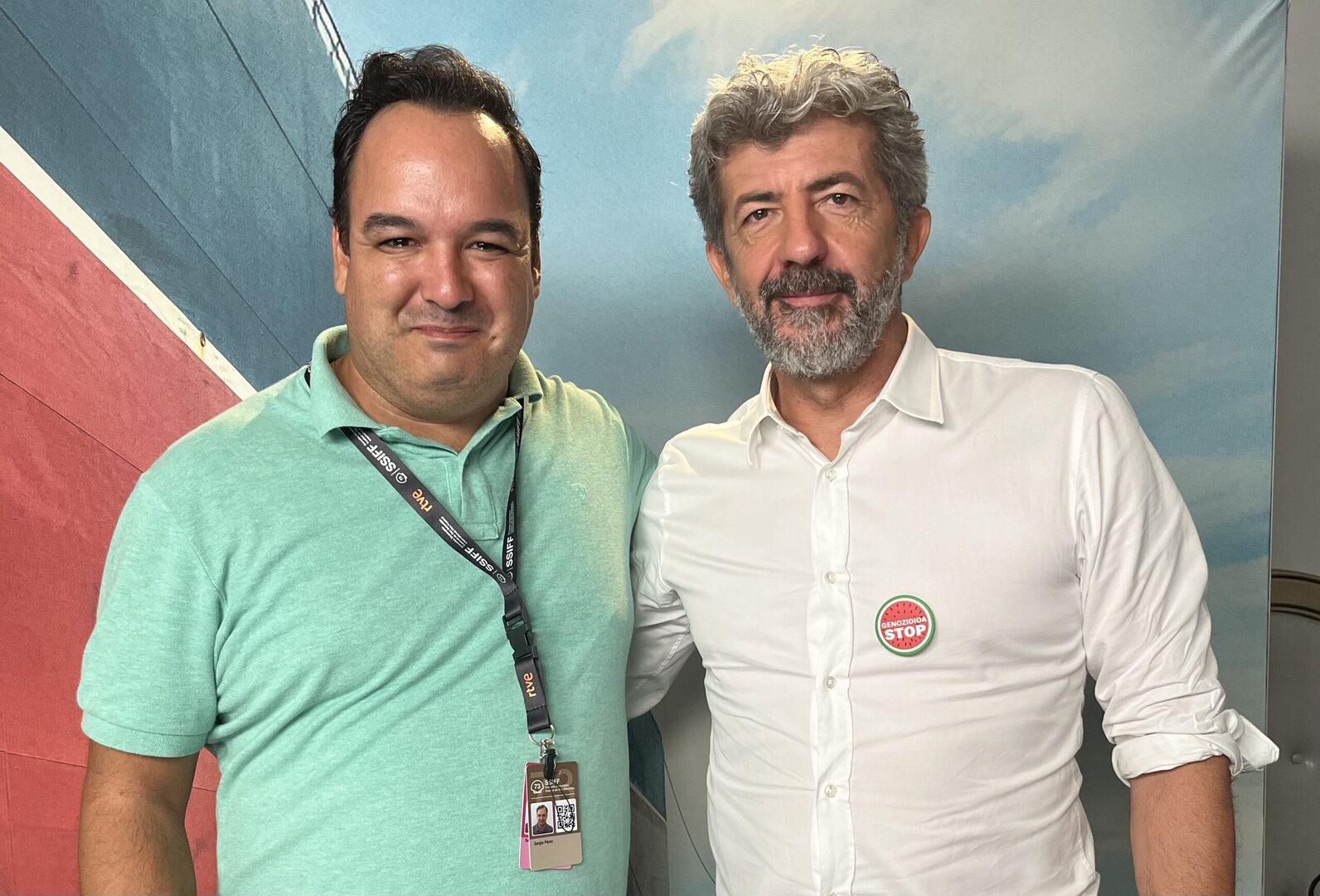 Sergio Pérez entrevista en el festival de San Sebastián al director Alberto Rodríguez por su historia sobre dos hermanos buzos en Huelva.