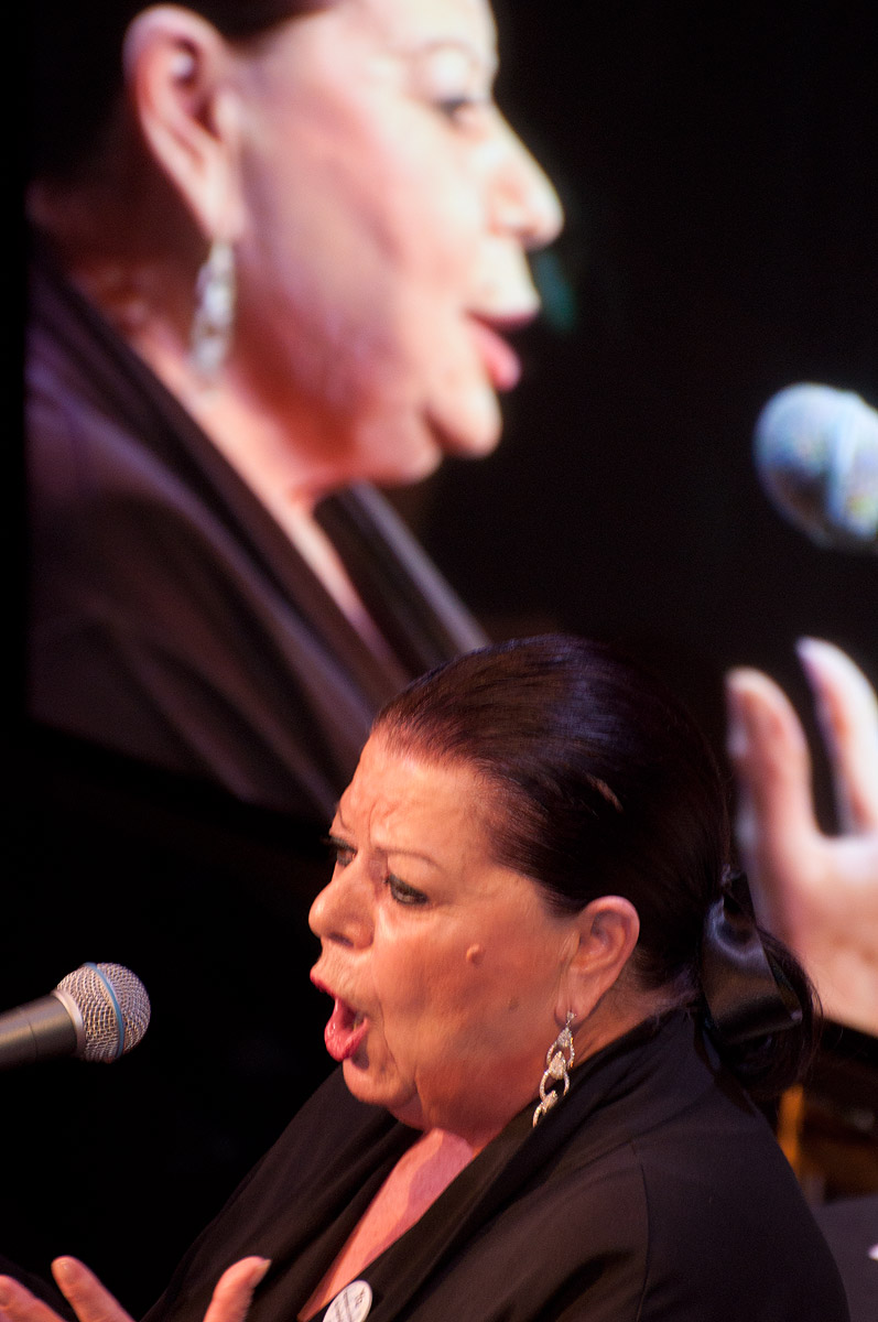 Carmen, en un momento de su actuación, con su imagen en una pantalla de fondo