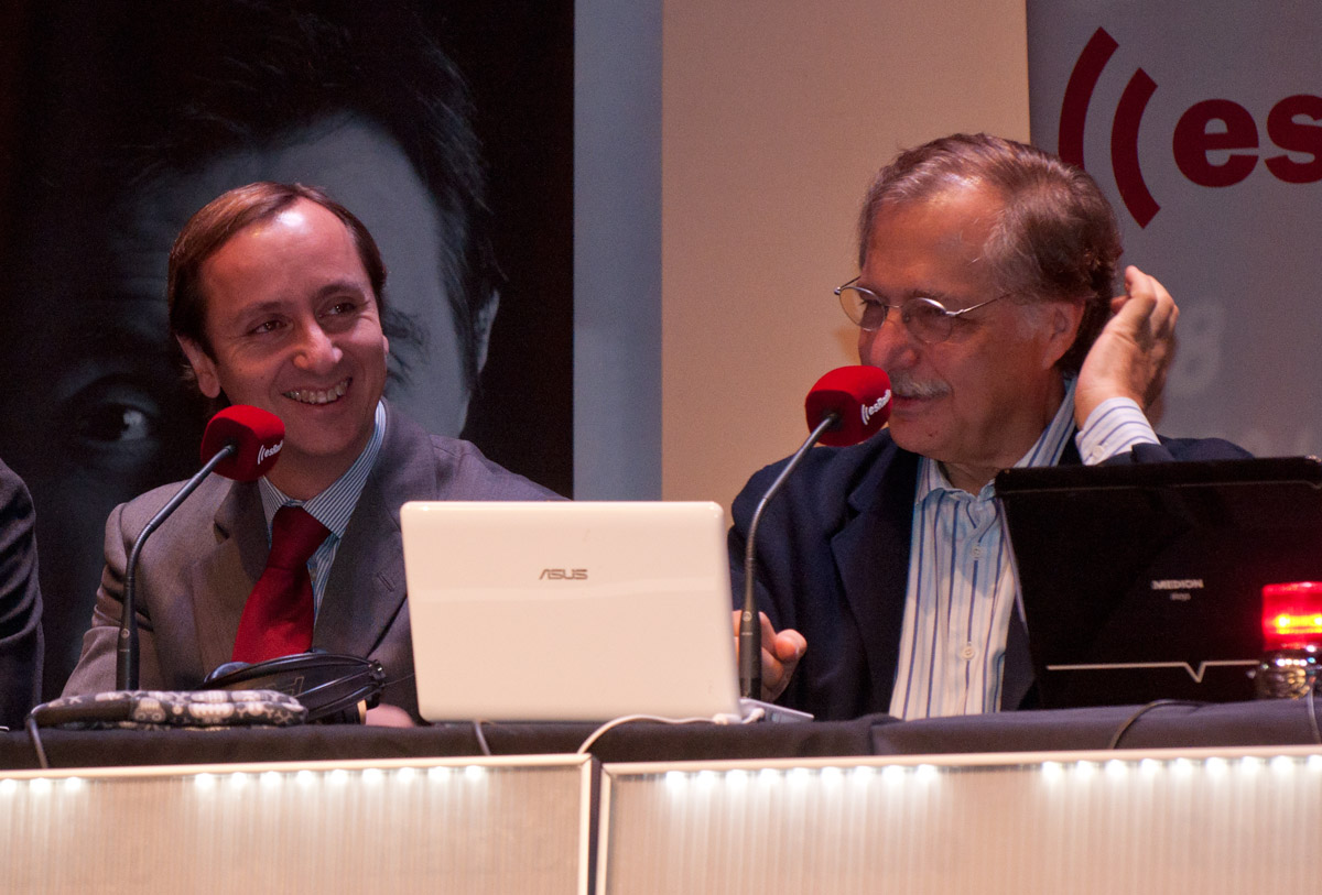 Luis Herrero y Federico comentan entre sonrisas una noticia en la tertulia.