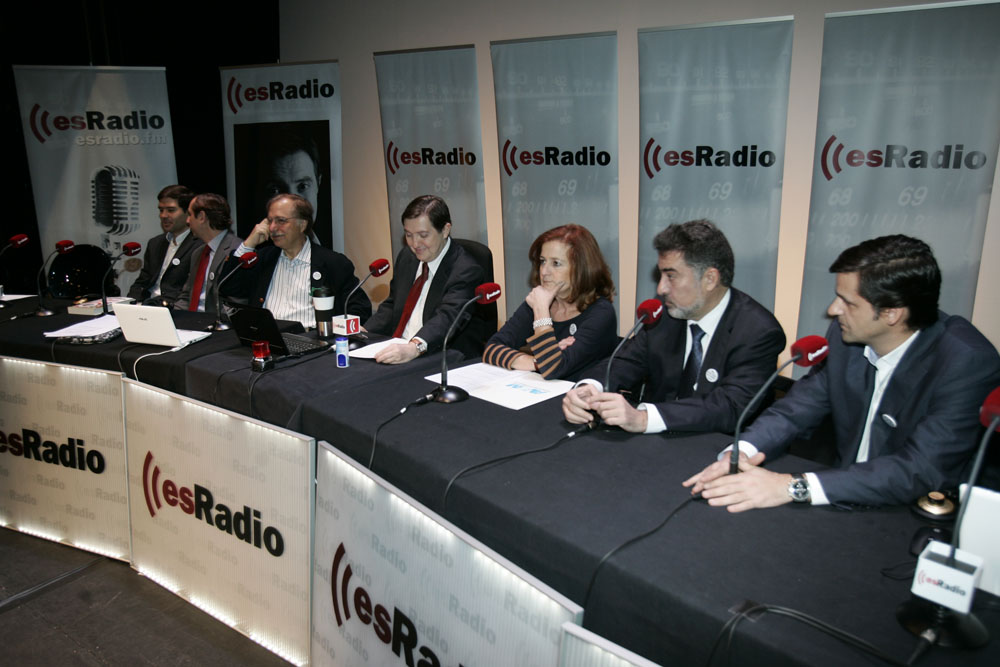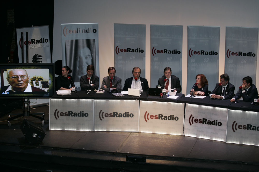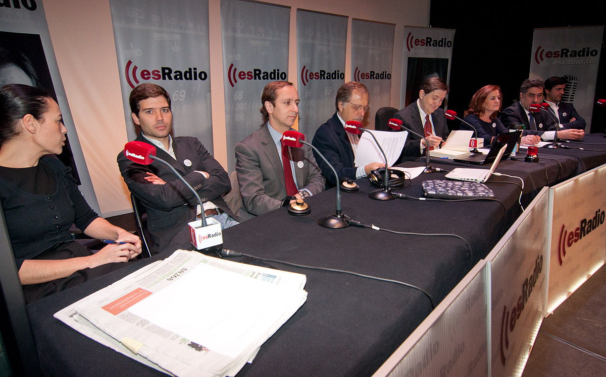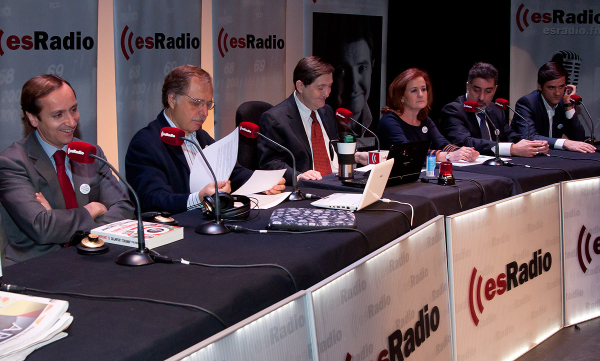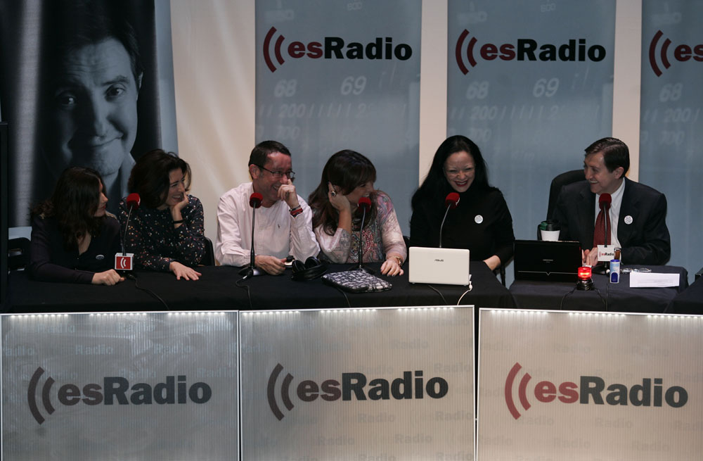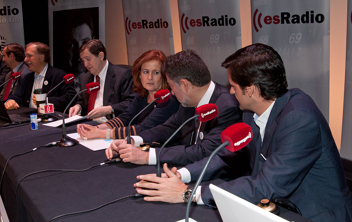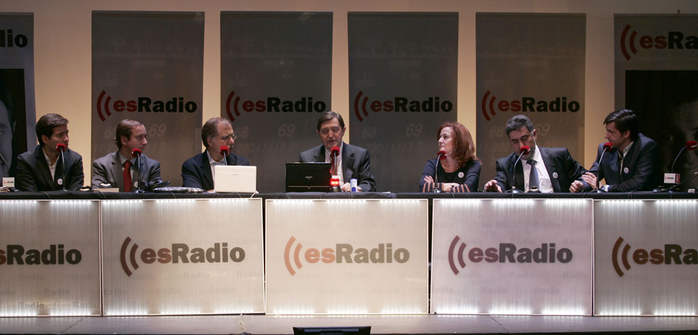 De izquierda a derecha, Rosana Laviada, Dieter Brandau, Carlos Cuesta, Luis Herrero, Federico Jiménez Losantos, Ángeles González, Luis del Pino y Javier Somalo.
