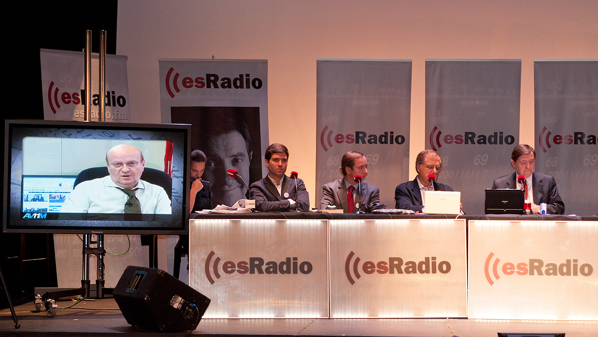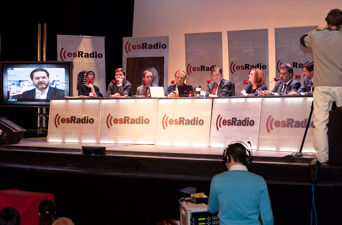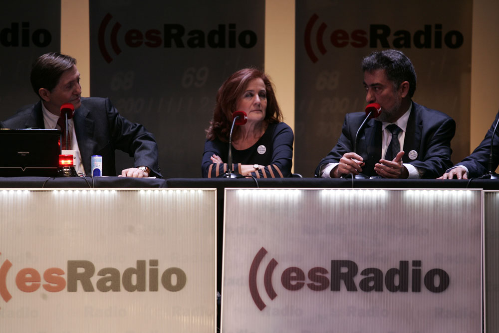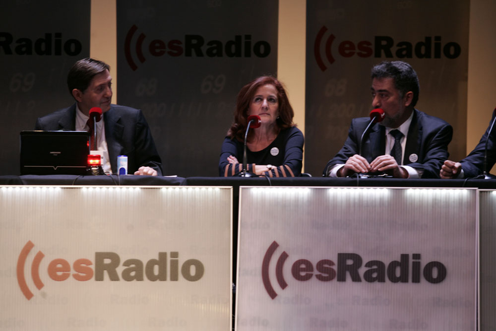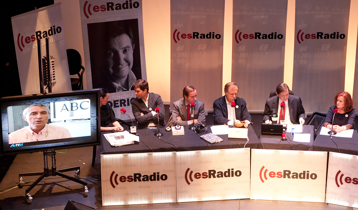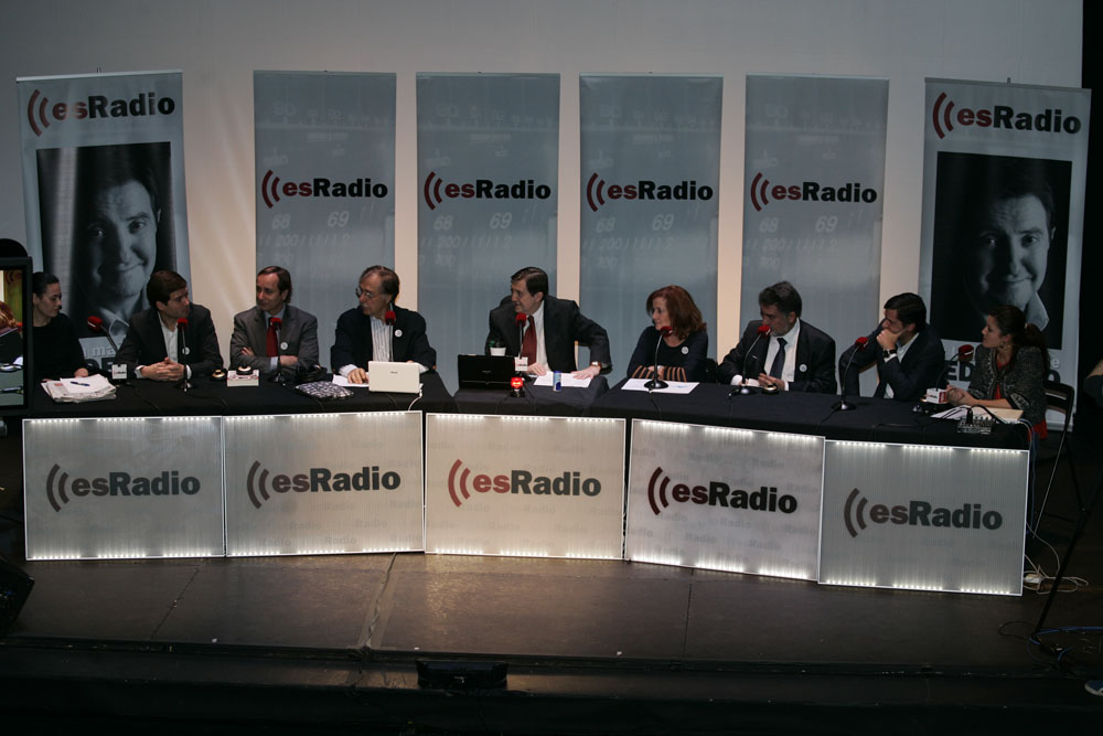 De izquierda a derecha, Rosana Laviada, Dieter Brandau, Carlos Cuesta, Luis Herrero, Federico Jiménez Losantos, Ángeles González, Luis del Pino y Javier Somalo.