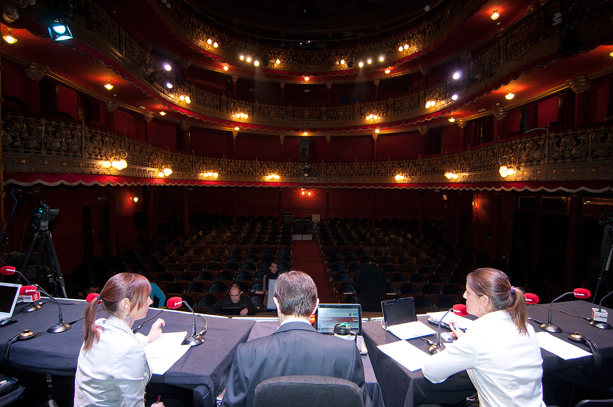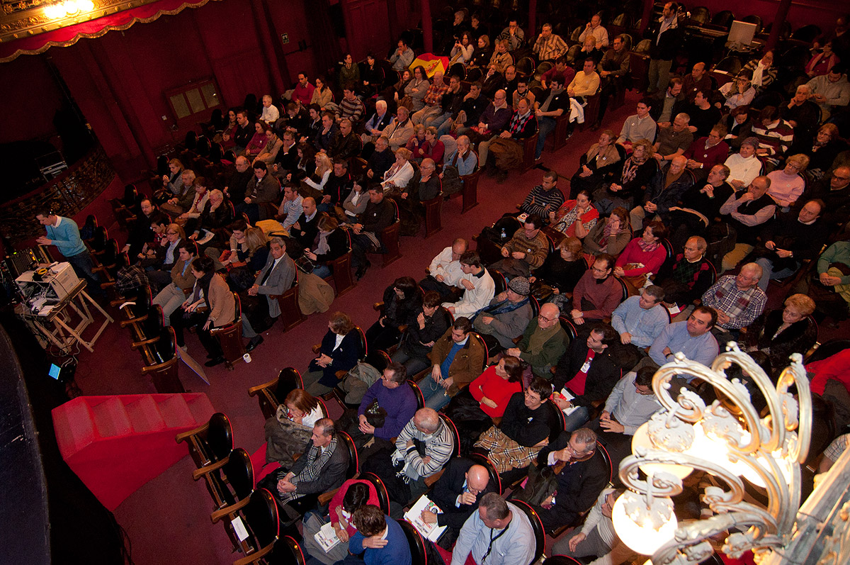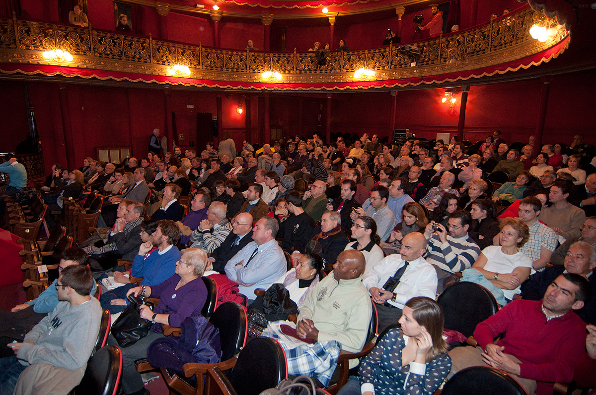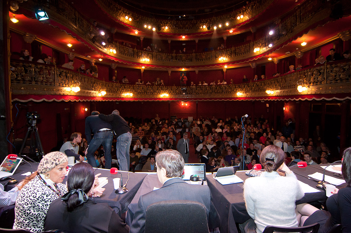 Un plano general desde el punto de vista de el escenario, con el público de frente.