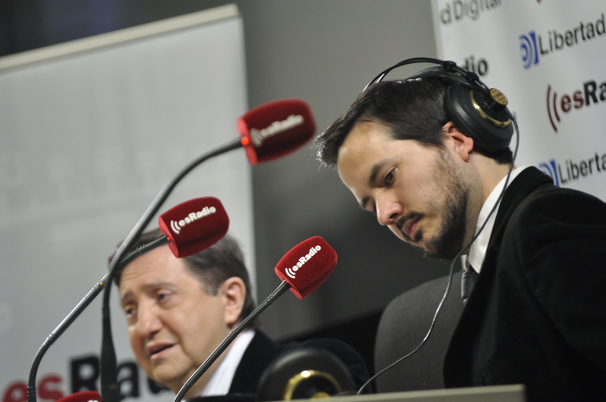 Miguel Ángel Pérez, en primer plano, concentrado frente al micrófono. Al fondo, Federico Jiménez Losantos, director de Es la Mañana