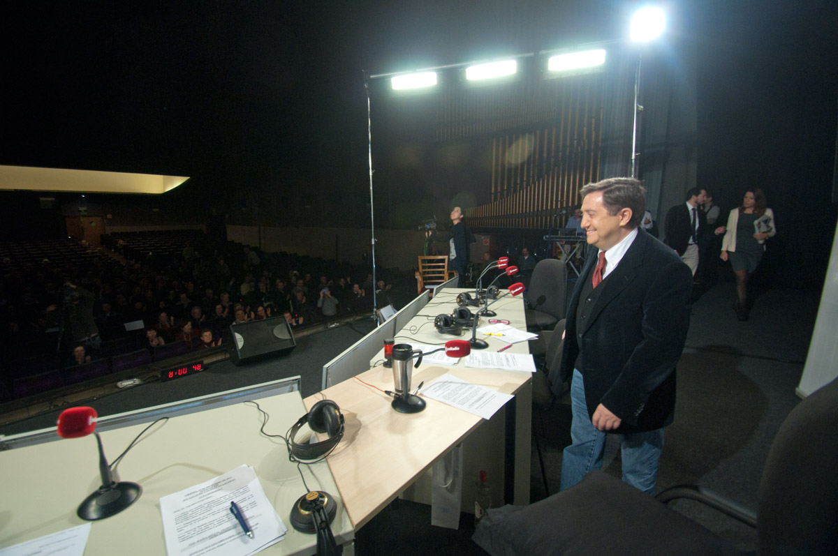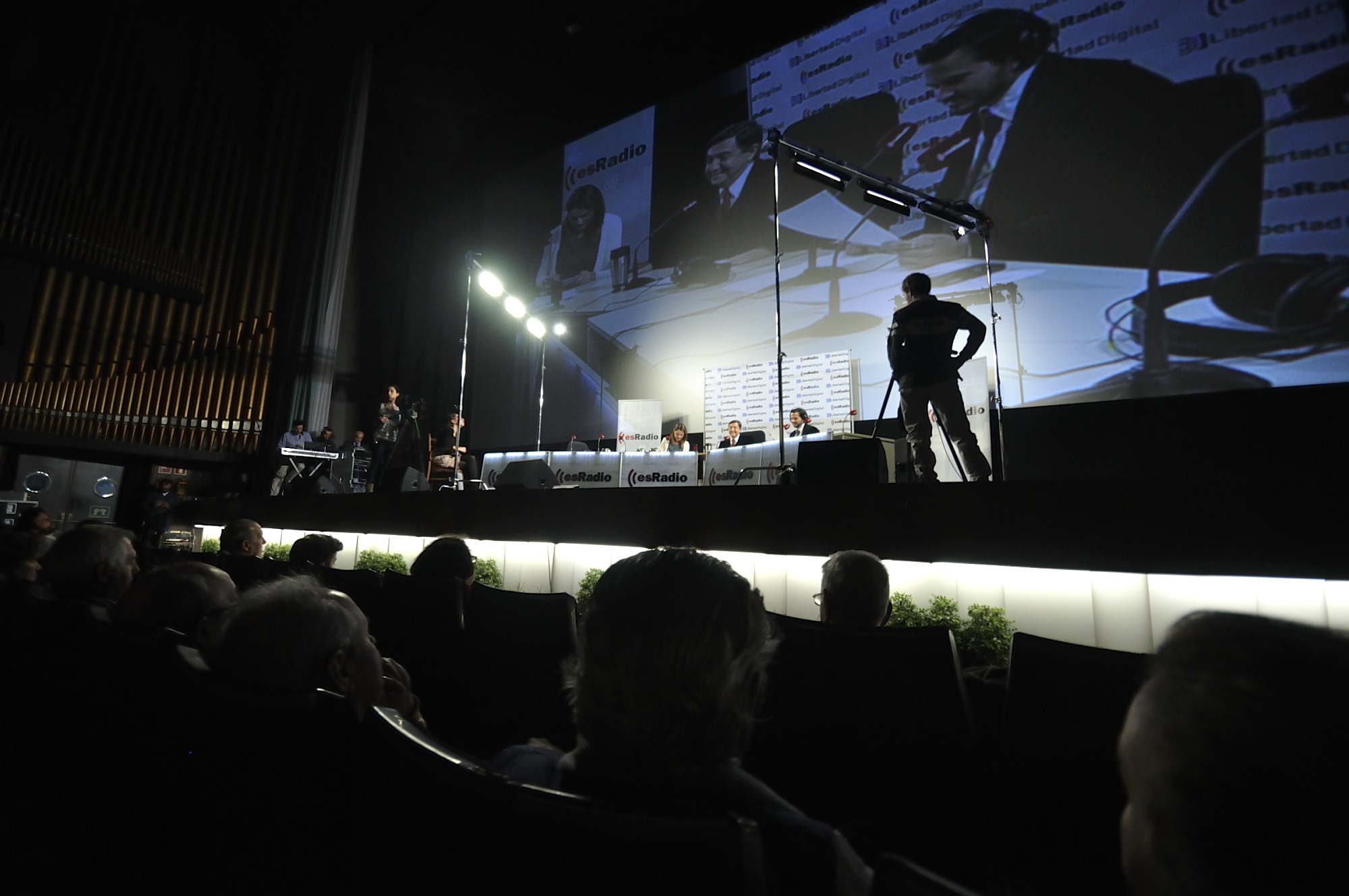Vista desde uno de los pasillos del cine Palafox, con la mesa de tertulia de Es la Mañana al fondo y Federico Jiménez Losantos en la pantalla gigante