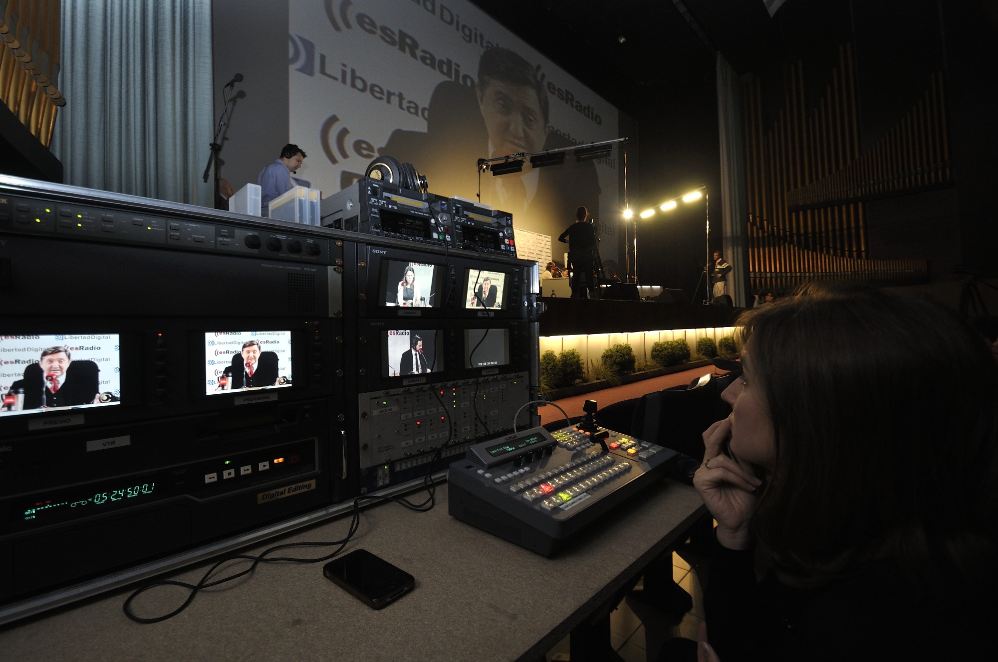 Imagen del control de realización durante la emisión de Es la Mañana de esRadio en el cine Palafox de Madrid