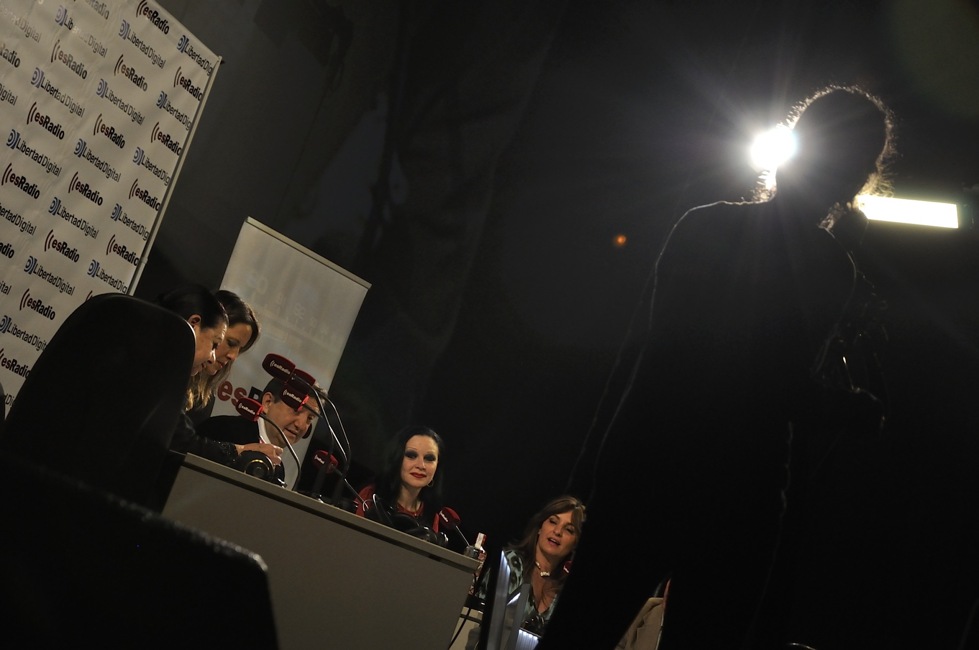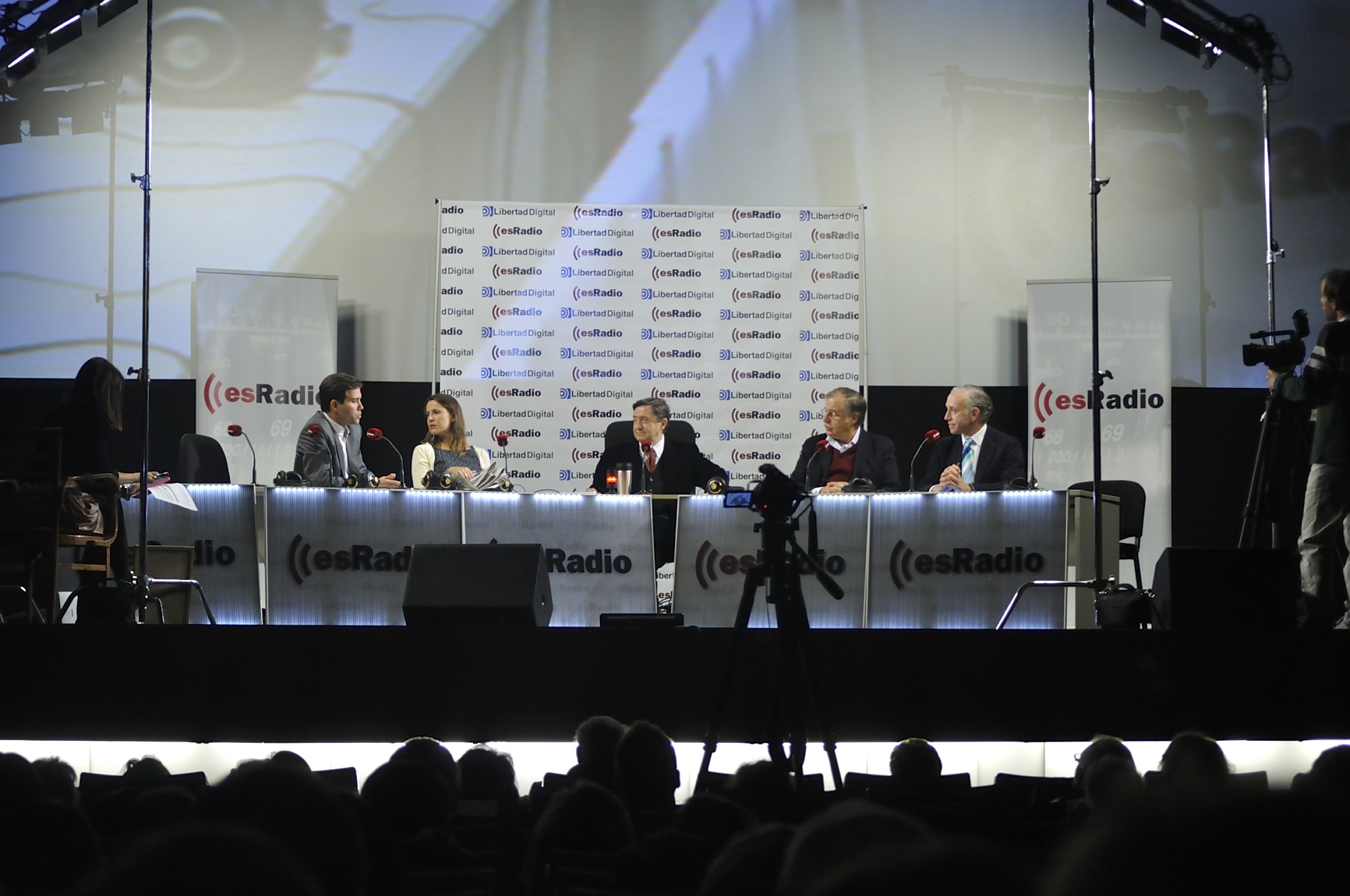 Vista de la mesa de tertulia en el cine Palafox. De izquierda a derecha: Dieter Brandau, Isabel González, Federico Jiménez Losantos, Luis Herrero y Eduarto Inda