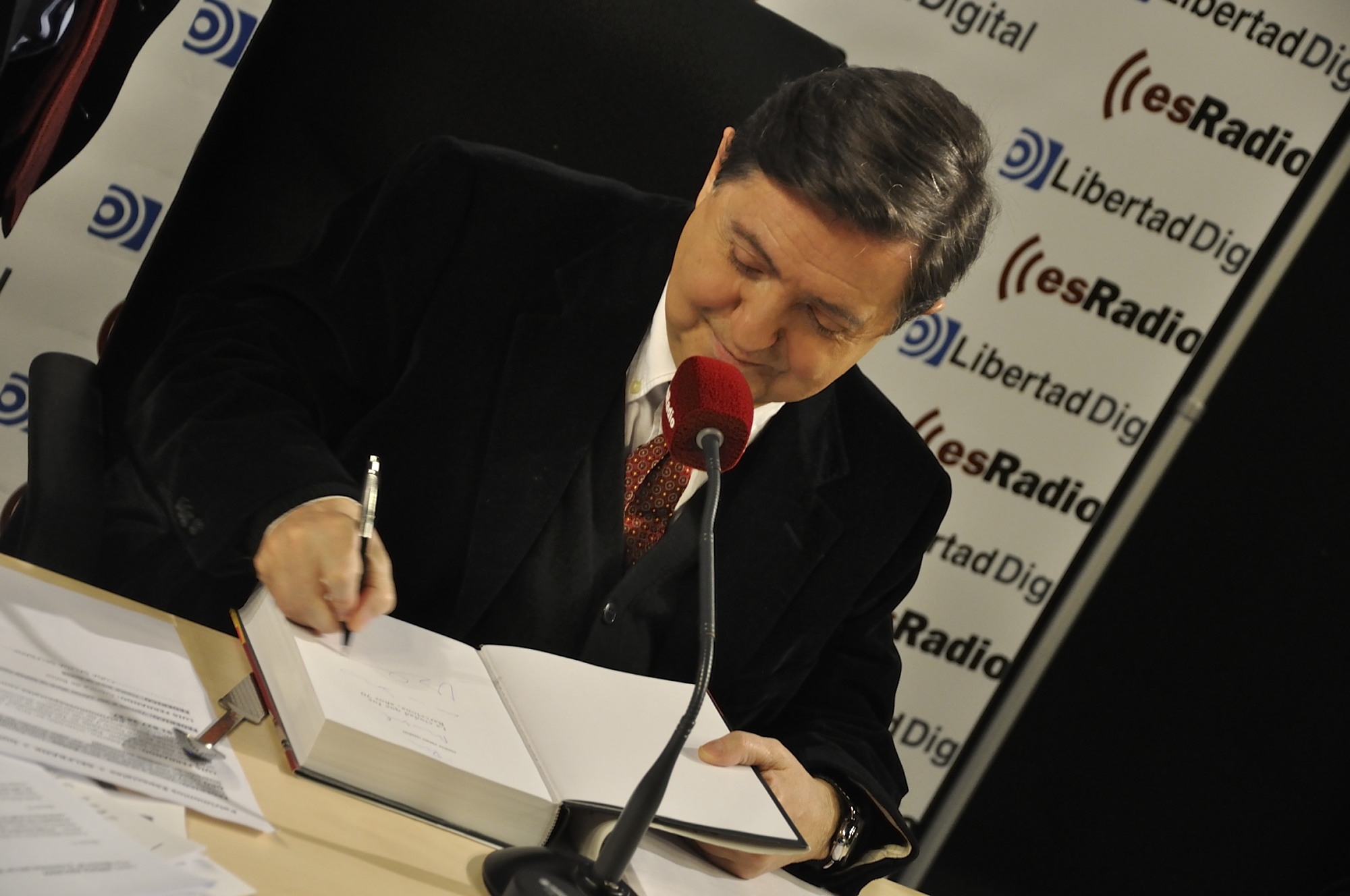 Federico Jiménez Losantos firma un libro durante una publicidad del programa emitido en directo desde el cine Palafox