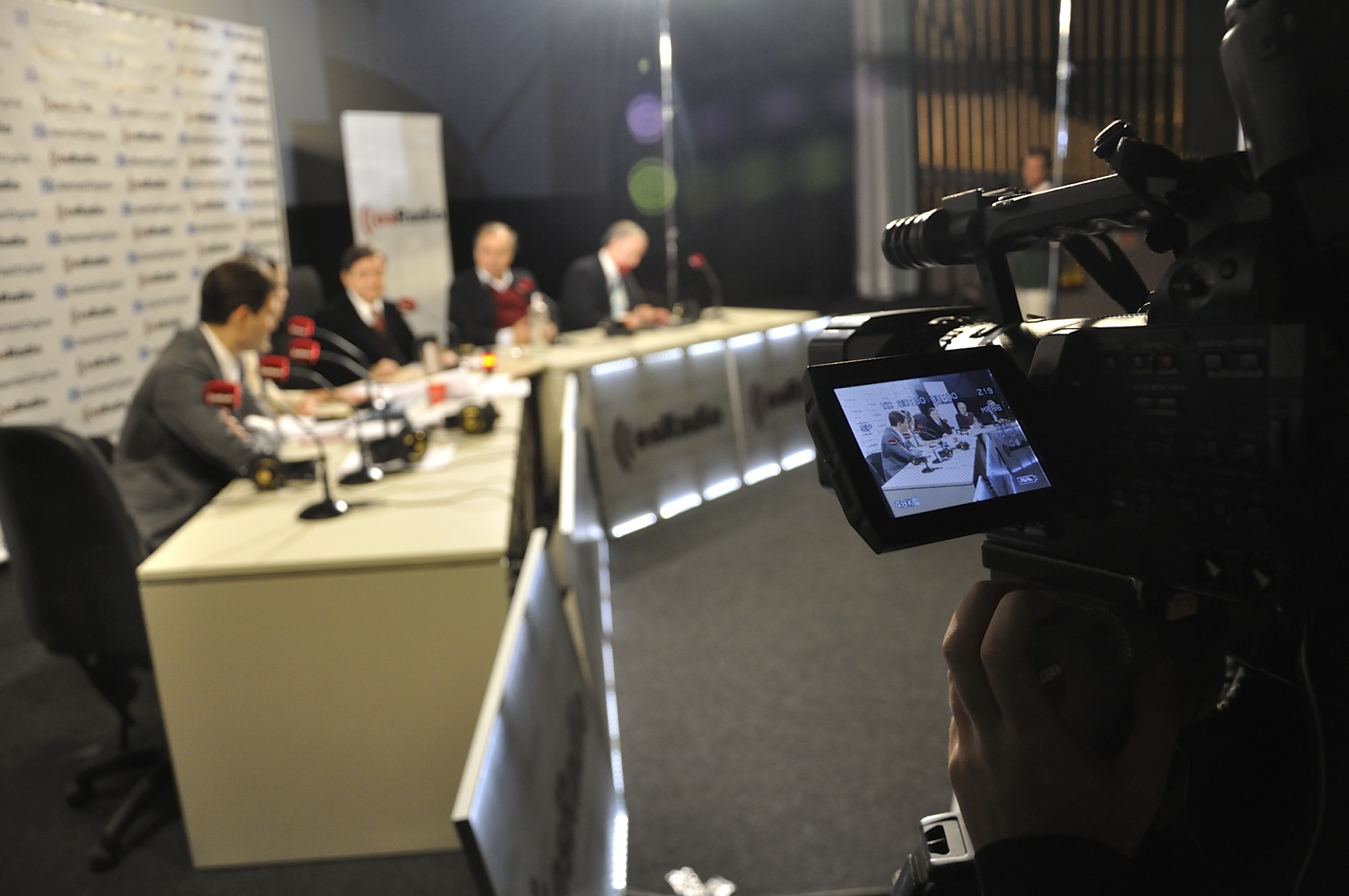 En primer plano, cámara de LDTV grabando el programa, con la mesa de tertulia al fondo
