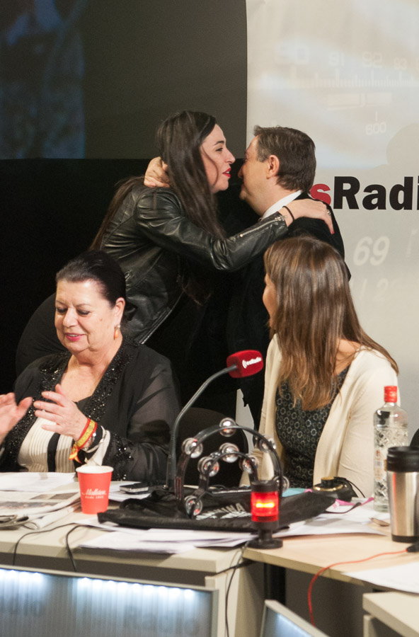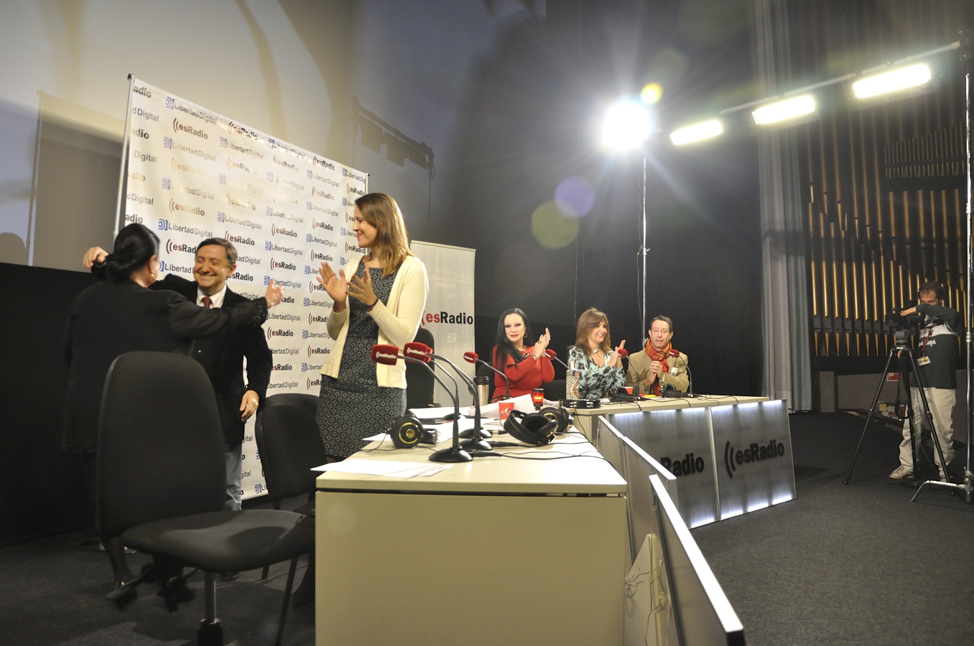 Beatriz Cortázar abraza a Federico Jiménez Losantos mientras Isabel González aplaude momentos antes de empezar la Crónica Rosa de Es la Mañana de esRadio