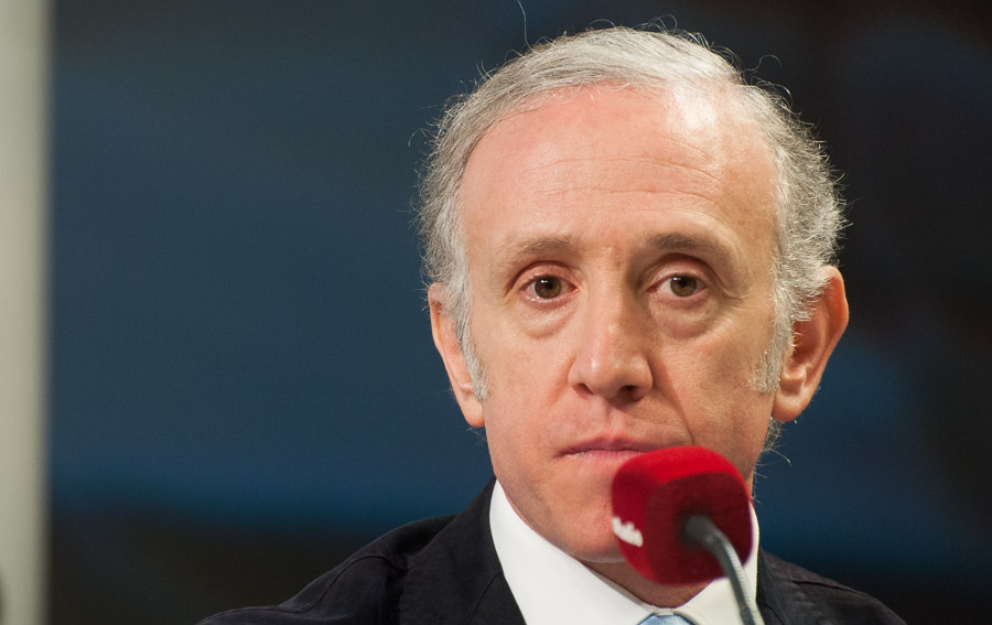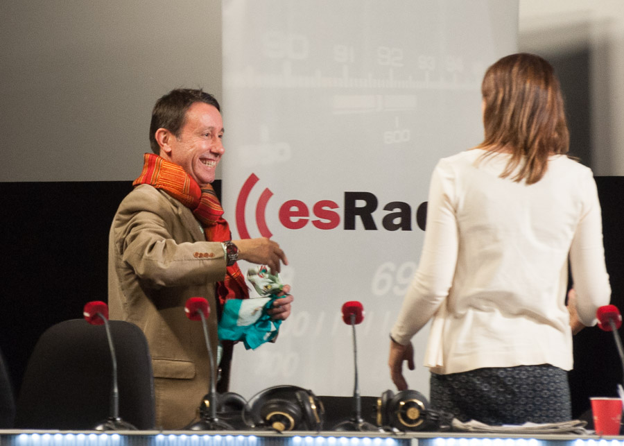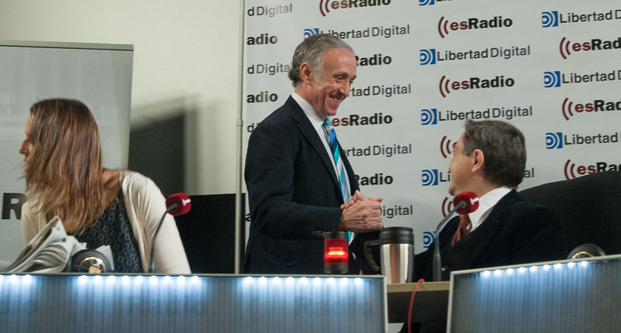 Eduardo Inda, del periódico El Mundo y tertuliano de esRadio, saluda a Federico Jiménez Losantos antes de empezar la tertulia del programa